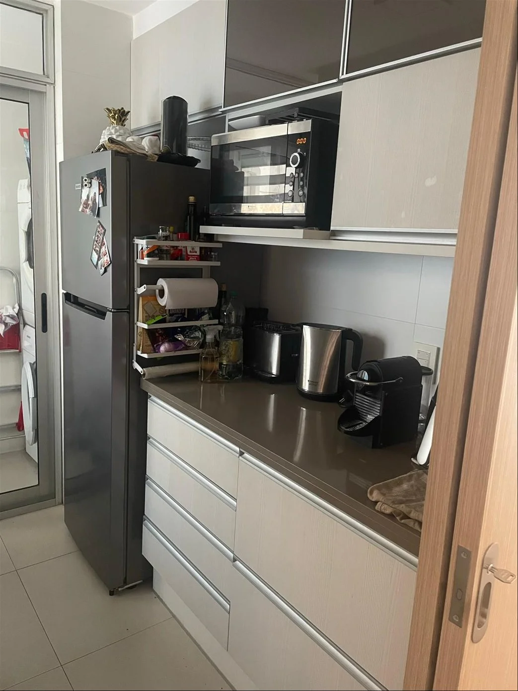Cocina con anafe, horno empotrado, campana, heladera y lavadora