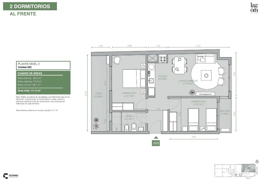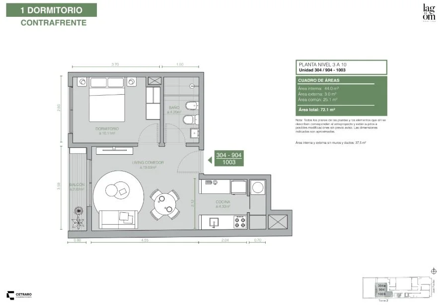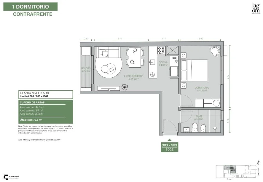 Edificio Lagom, compuesto por una torre de 11 niveles que ofrece 35 unidades entre monoambientes, 1 y 2 dormitorios, todas con terrazas o balcones que amplían el disfrute de cada espacio. Su arquitectura prioriza la amplitud, la luz natural y las terminaciones de primer nivel, logrando ambientes modernos y funcionales.