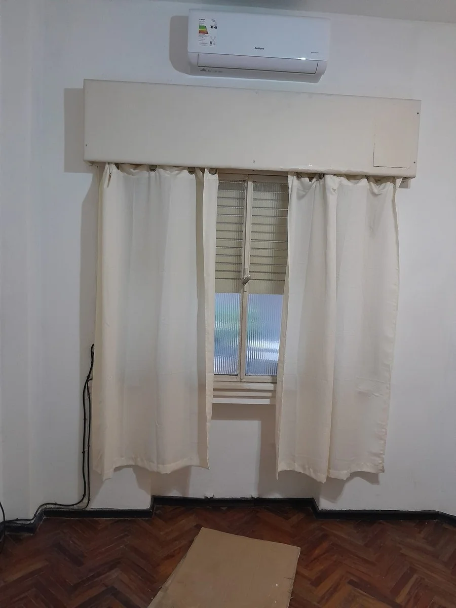 Sala de estar con piso de parquet, aire acondicionado y mueble empotrado ideal para almacenamiento.