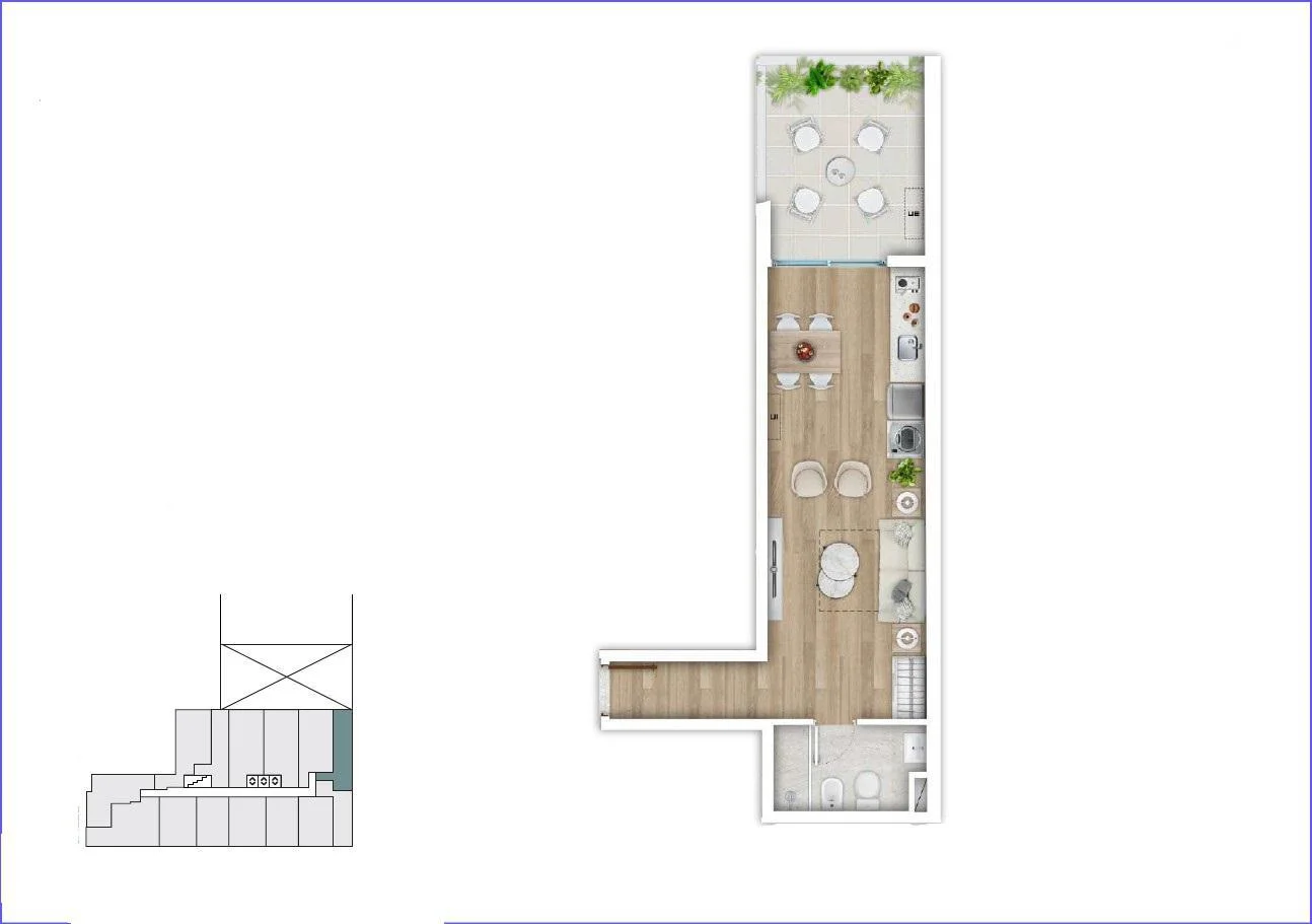Monoambiente con cocina integrada con placares, 1 dormitorio, 1 baño. Patio de 10 m2.