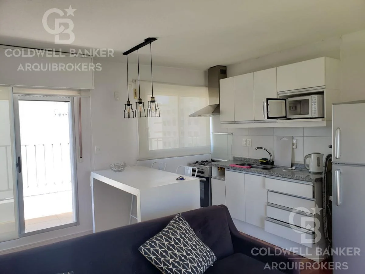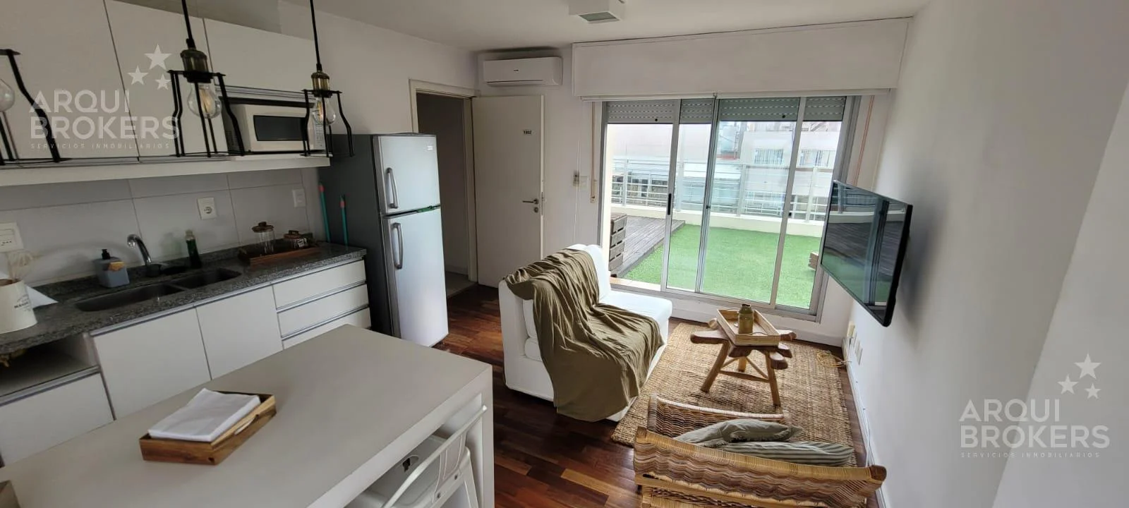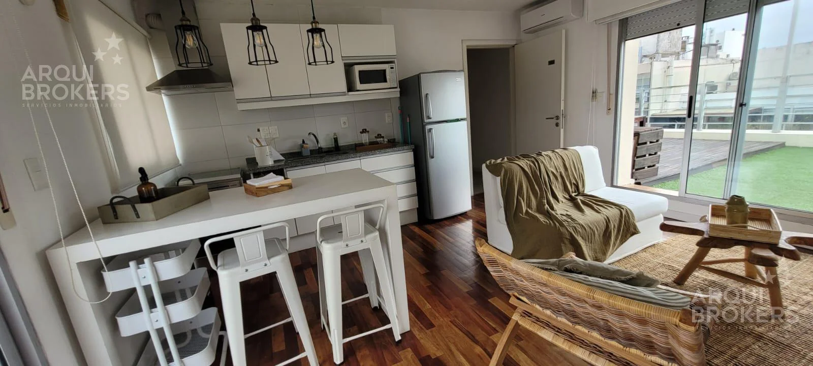 Living comedor al frente con salida a terraza. Cocina integrada con barra. 1 dormitorio y 1 baño. Terraza lavadero con lavarropas y tender.