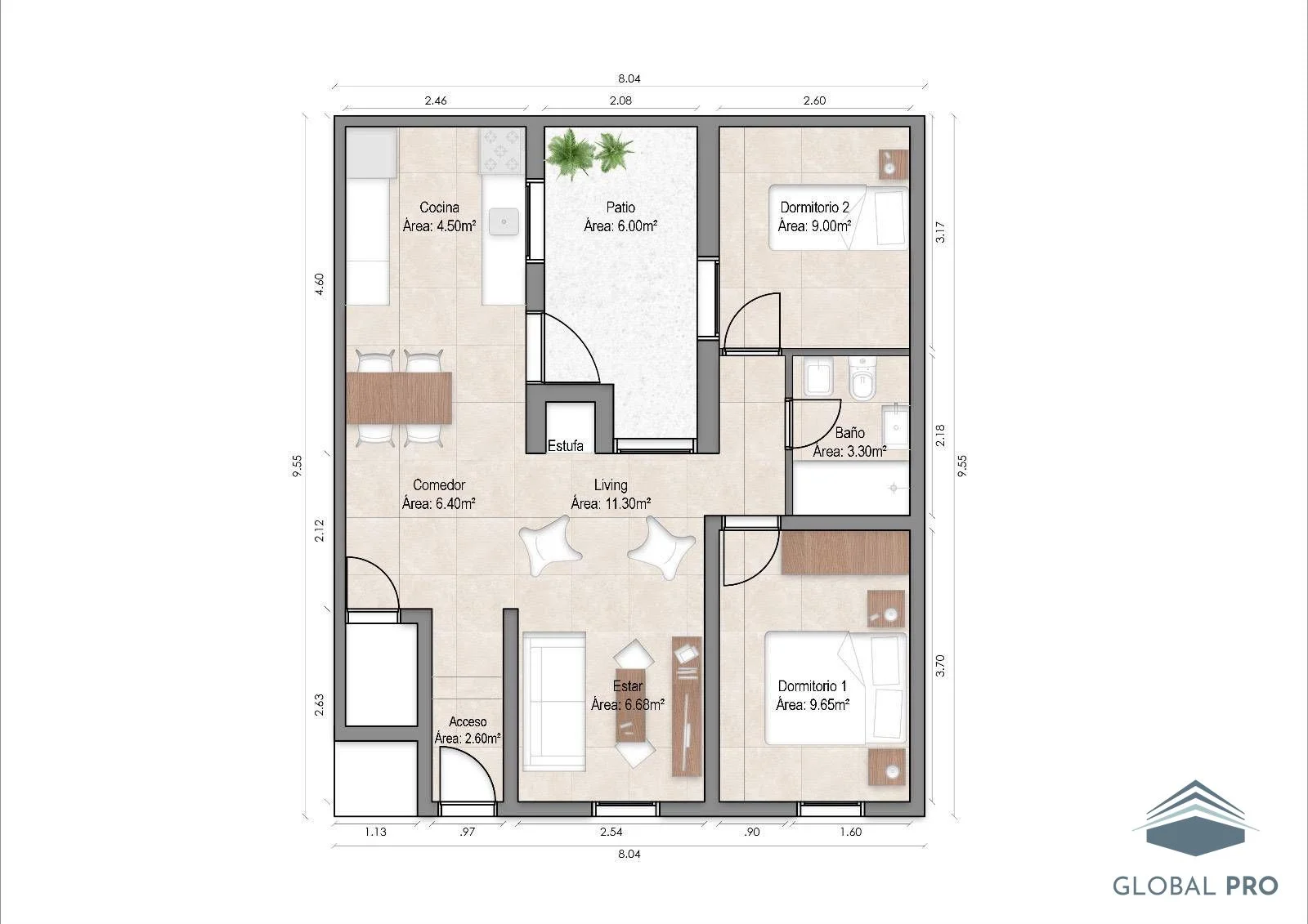 Es una vivienda de estilo con amplios espacios distribuidos en 57 m² internos, además goza de un patio de 9 m² que aporta espacio de desahogo, ideal para disfrutar al aire libre o destinar a un rincón verde