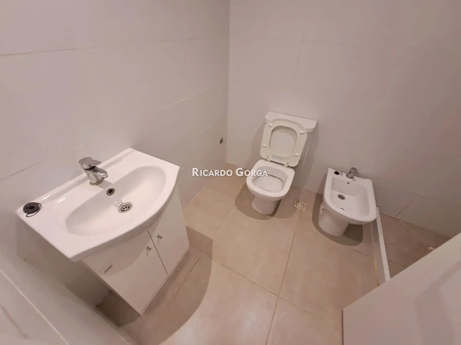 Baño completo junto a dormitorio, con piso porcelanato y revestimiento a dos metros.