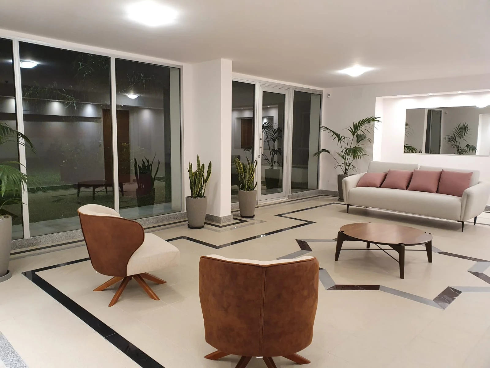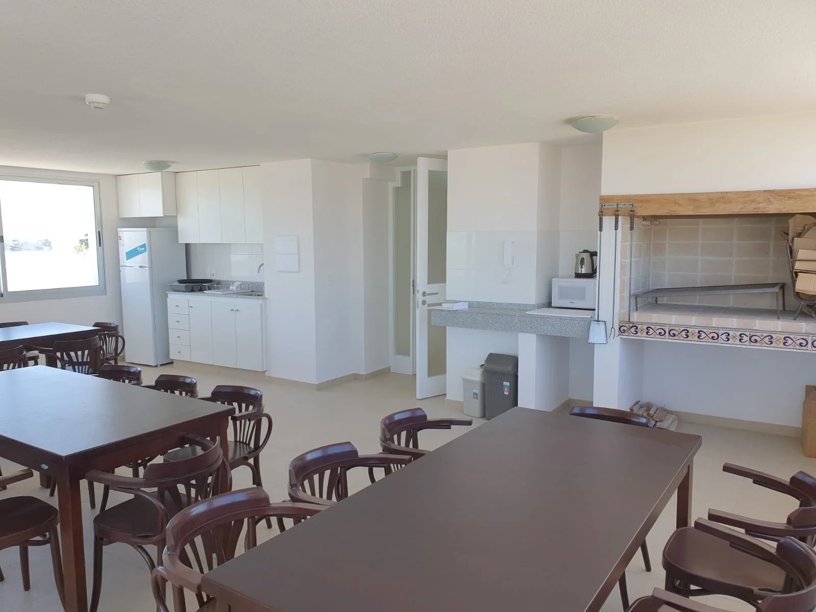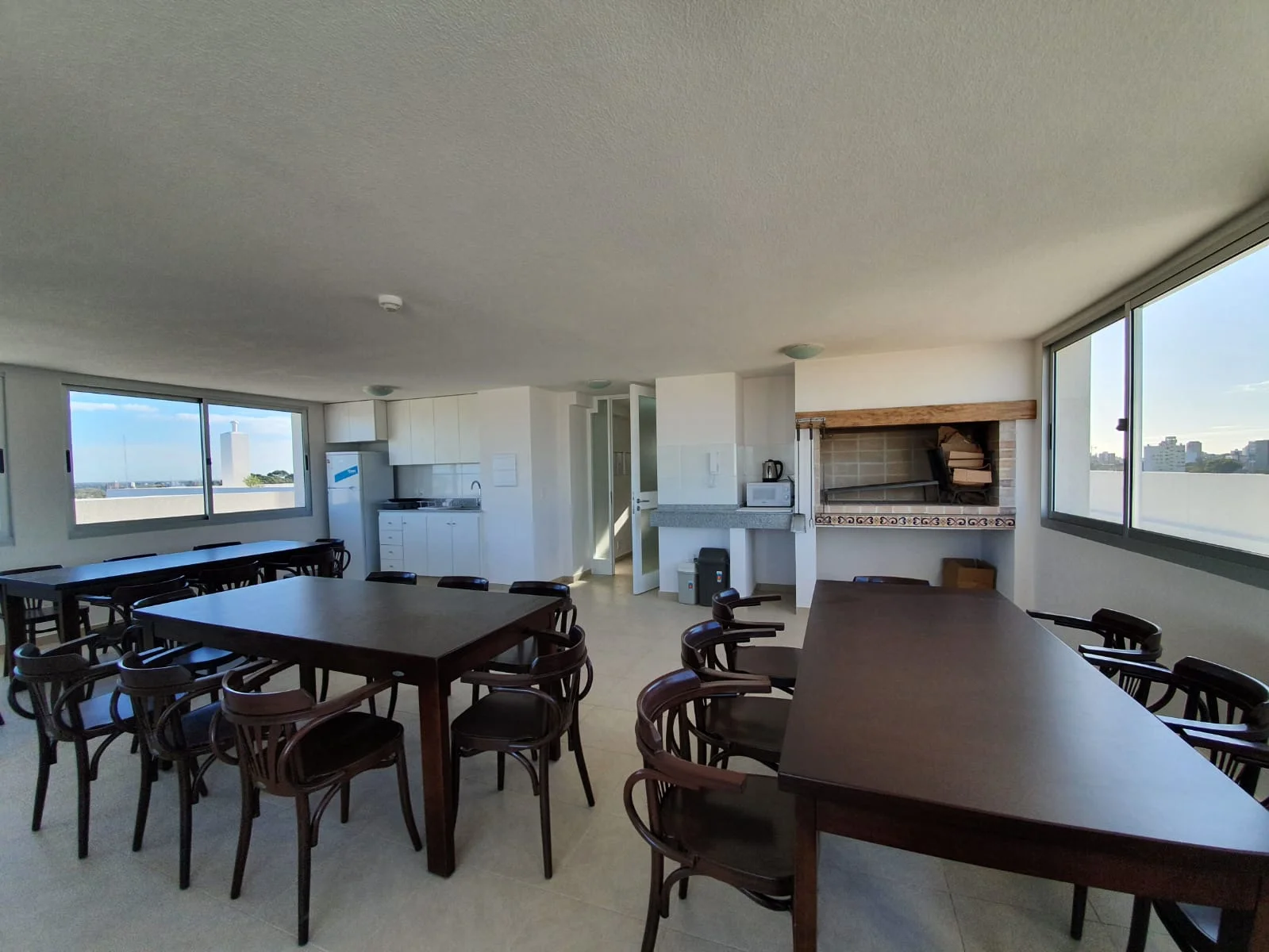 El edificio ofrece áreas comunes como salón de usos múltiples con cocina y mesas, ideales para reuniones y actividades sociales, además de un patio central con césped y vegetación.