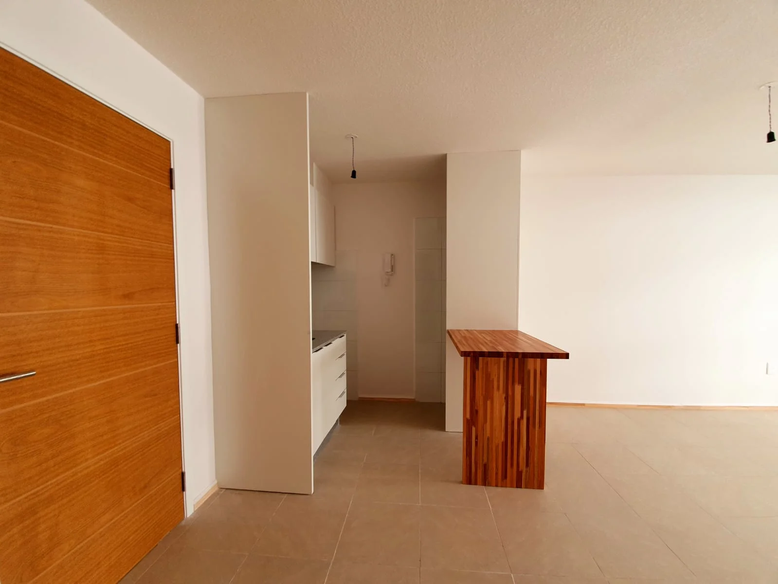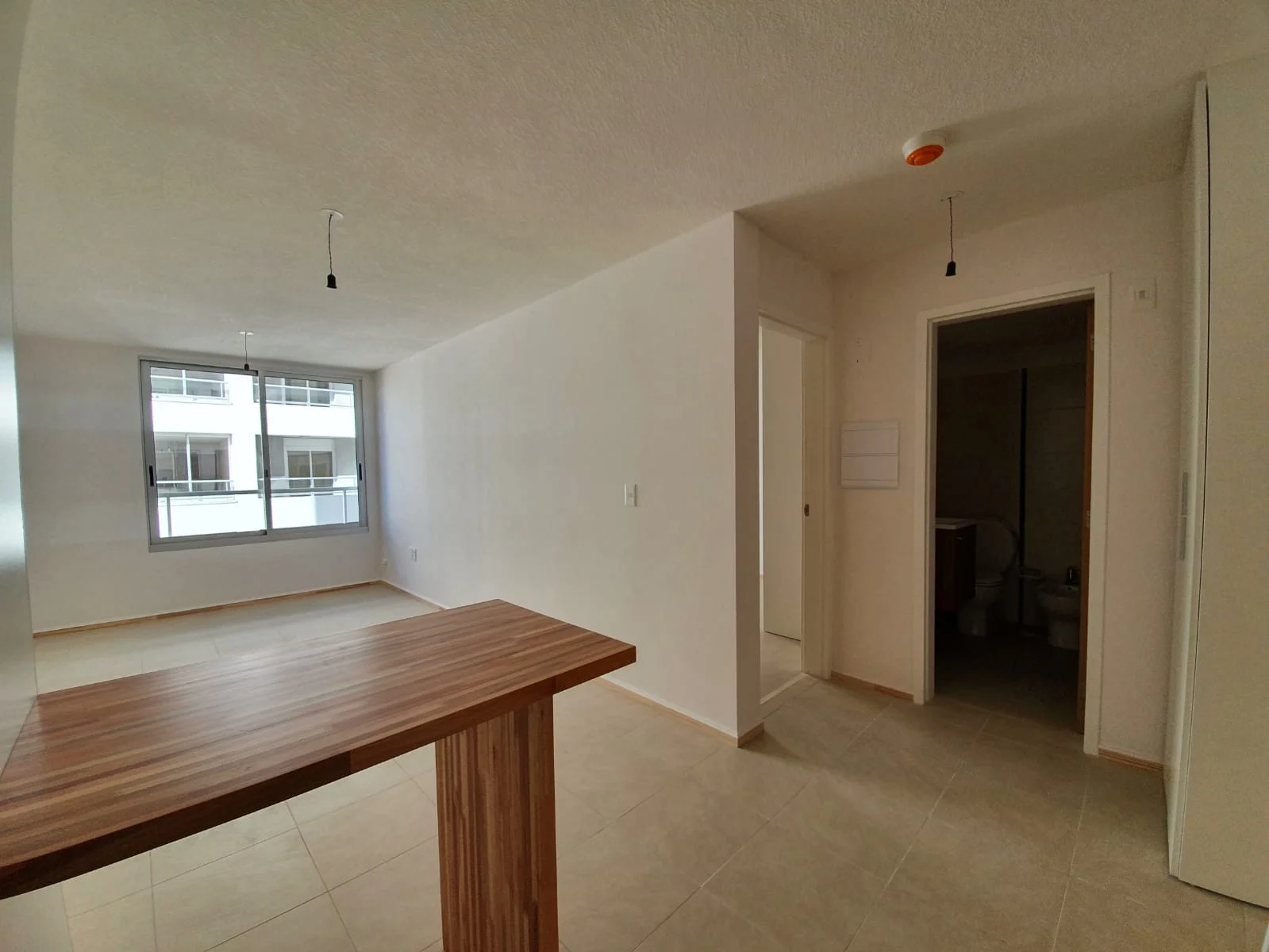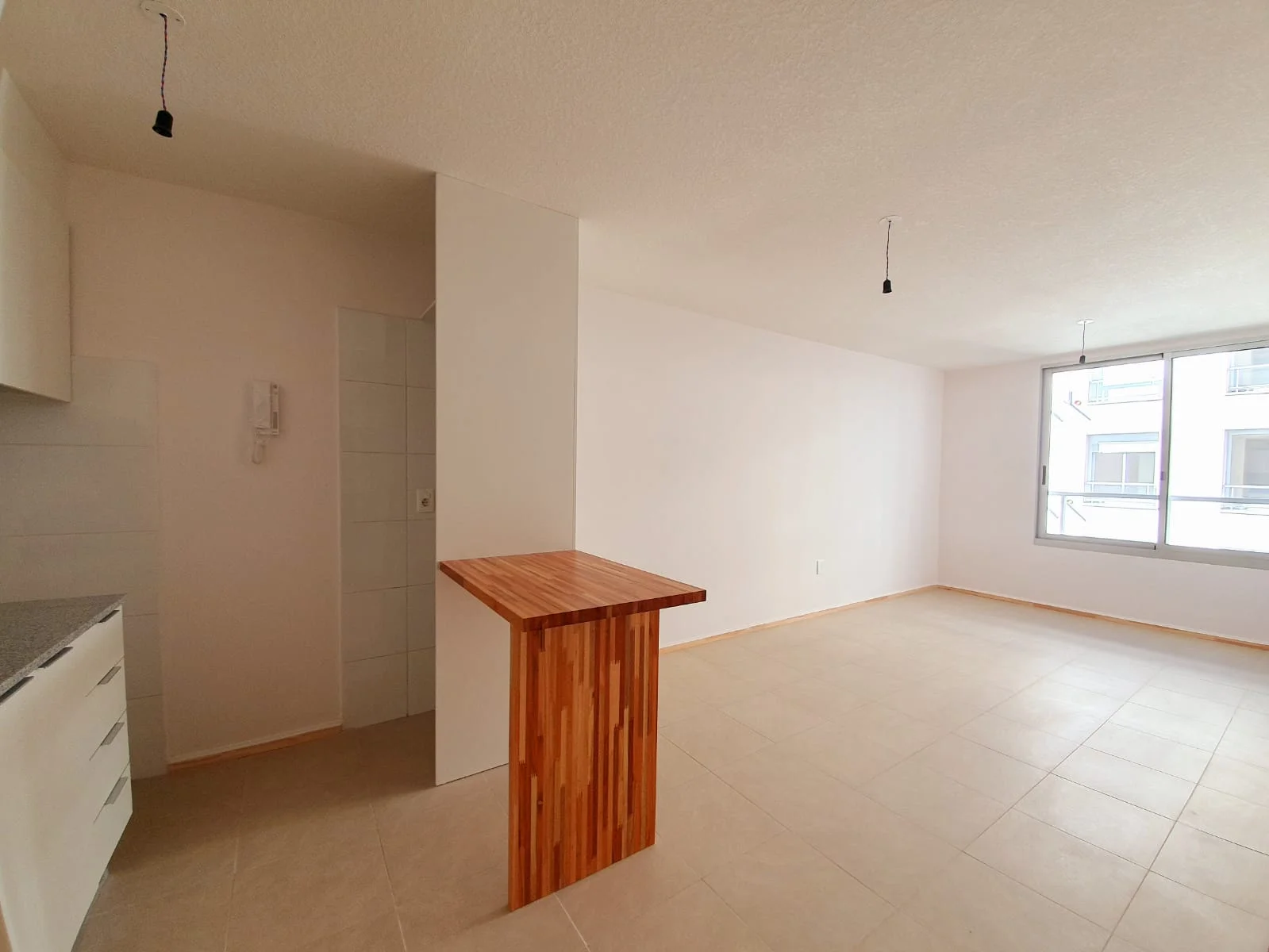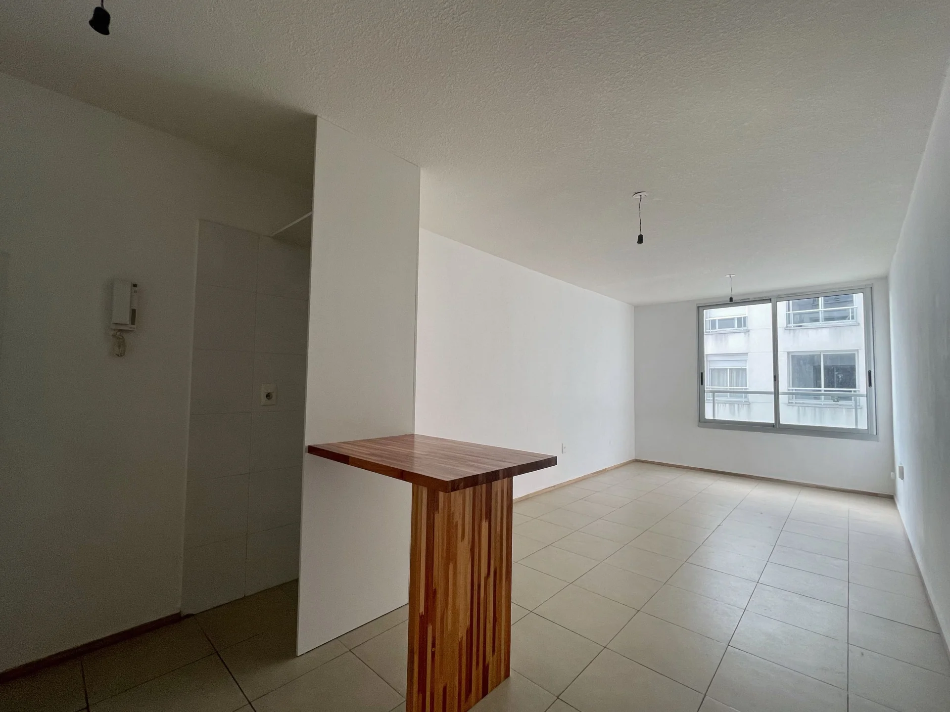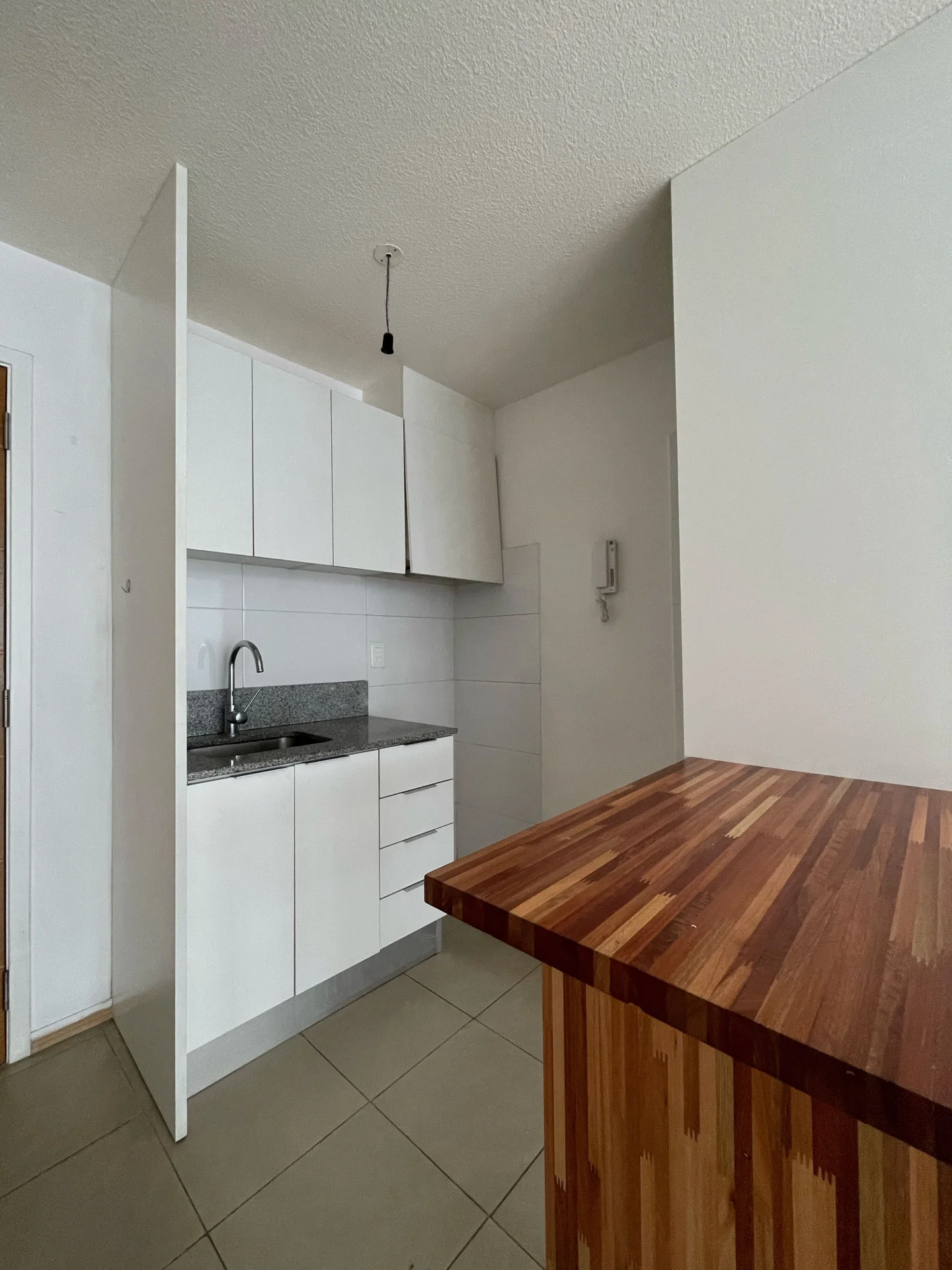 Cocina integrada al living-comedor, equipada con muebles de almacenamiento y barra de madera.