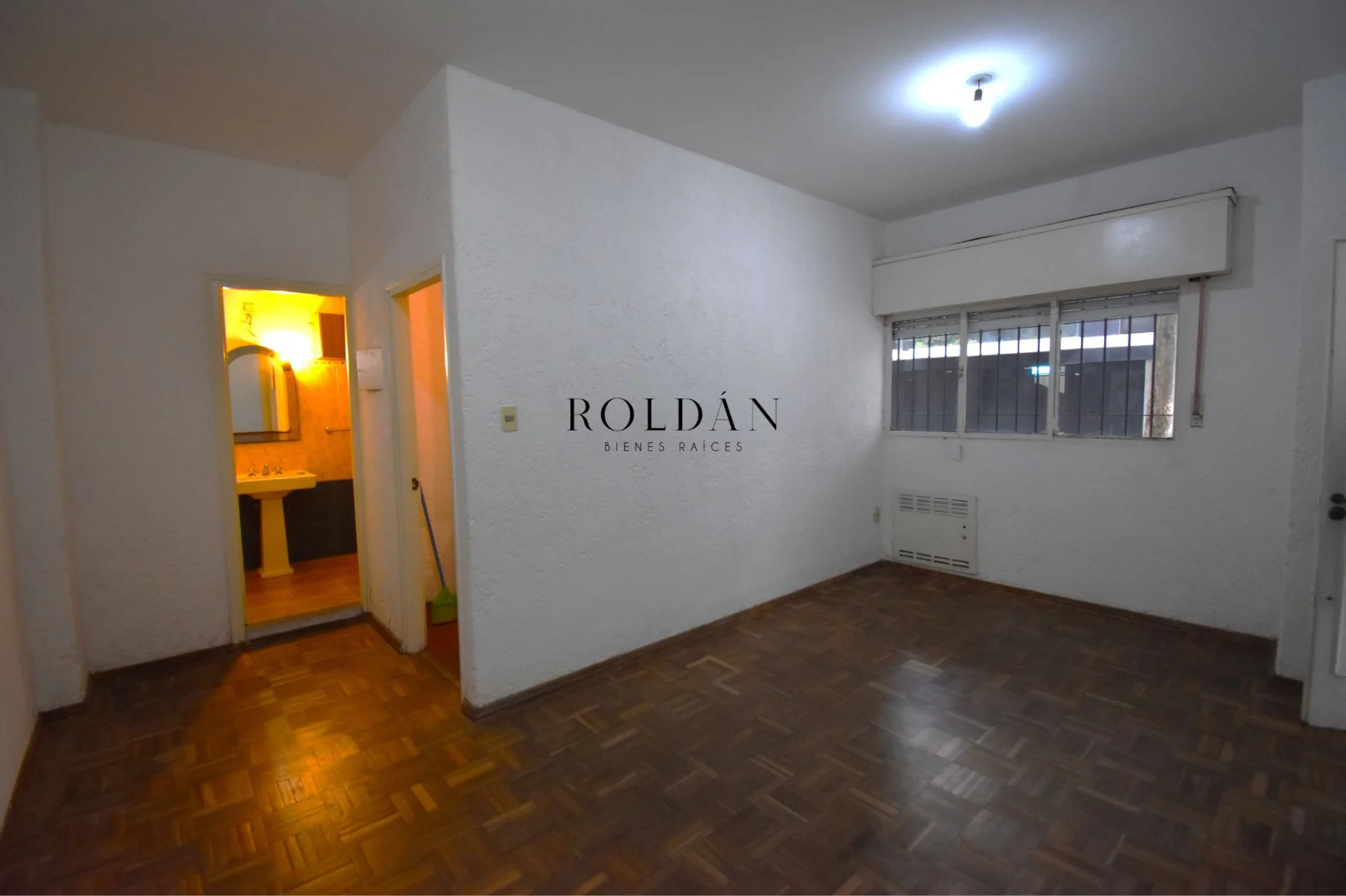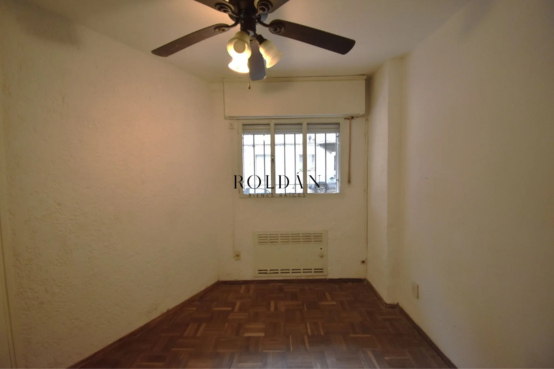 Dormitorio con piso de parquet y ventana con persiana y rejas a la calle, mueble empotrado y ventilador de techo. Amplio y cómodo baño completo con calefón.