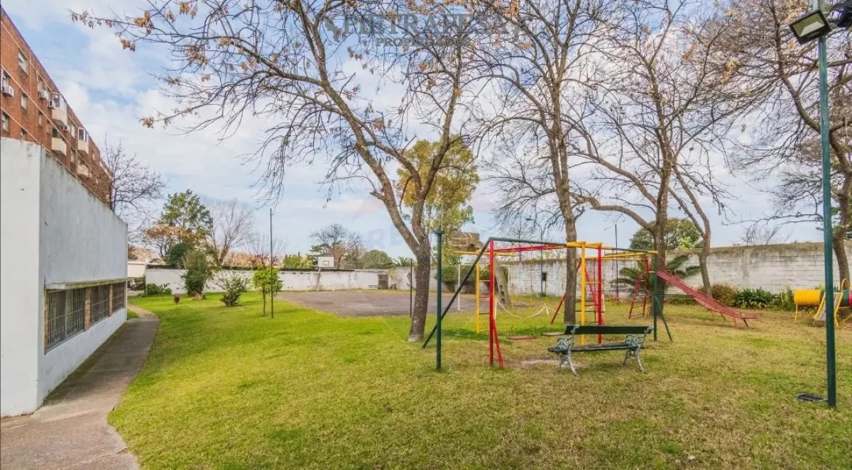 Gran fondo arbolado con cancha de fútbol y básquet, juegos infantiles, parrilleros techados de uso común con baño.