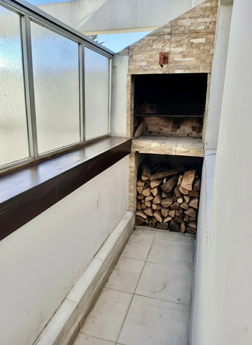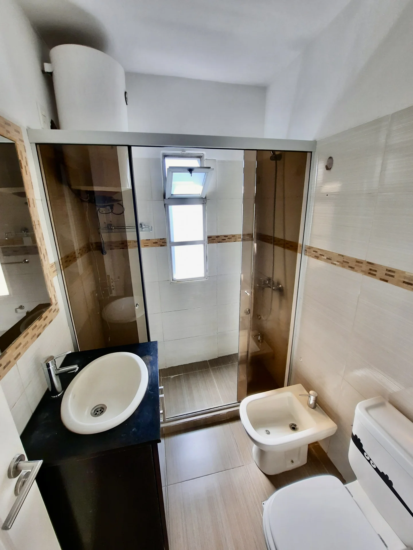 El baño es completo, con mampara de vidrio y calefón de 60 litros incluido. El apartamento dispone de terraza con parrillero y mesada. Incluye cortinas roller, campana y armarios en los dormitorios.