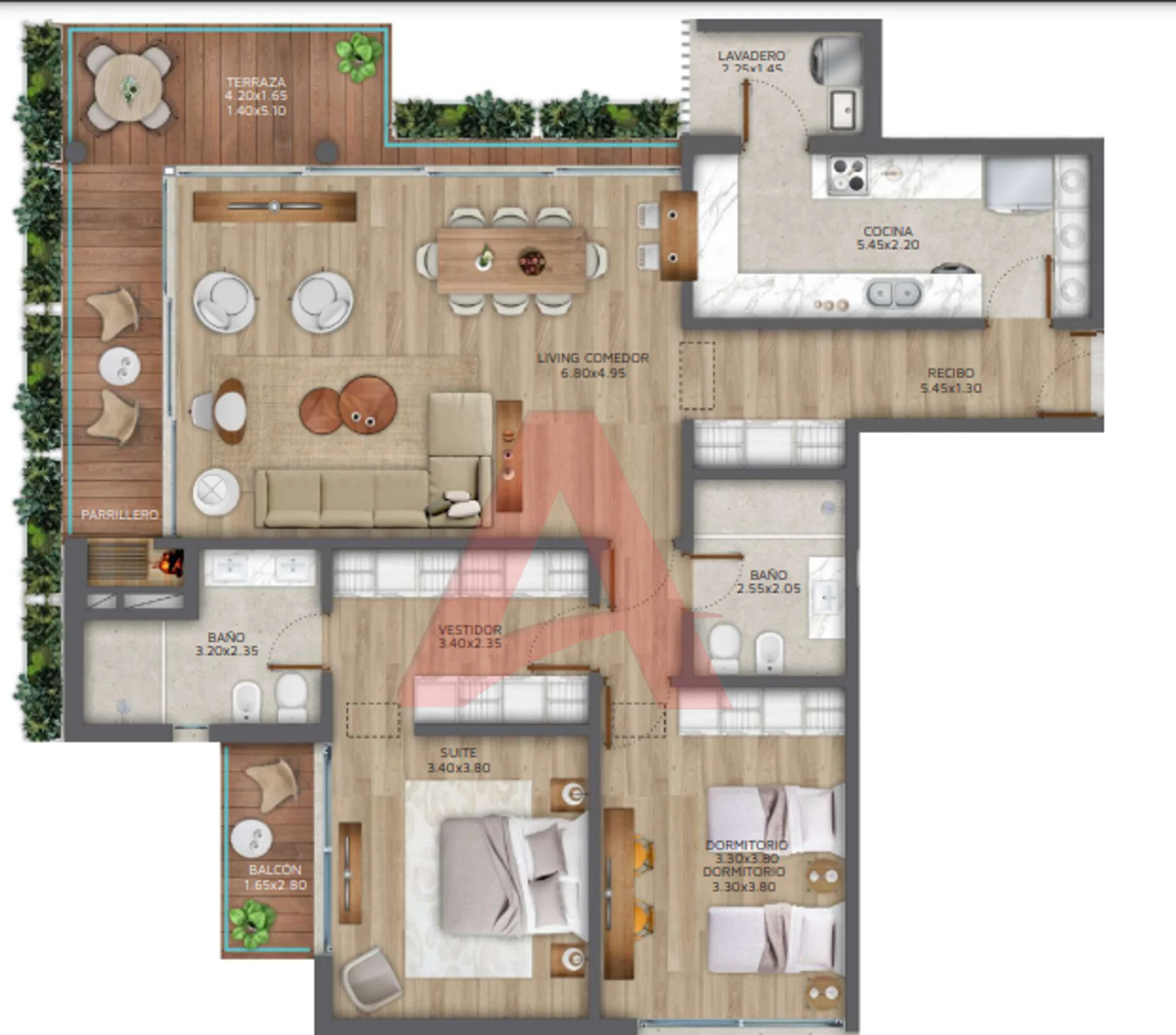 METRAJE: 121 m2 área propia + 21 m2 terrazas + 122 m2 de rooftop con parrillero