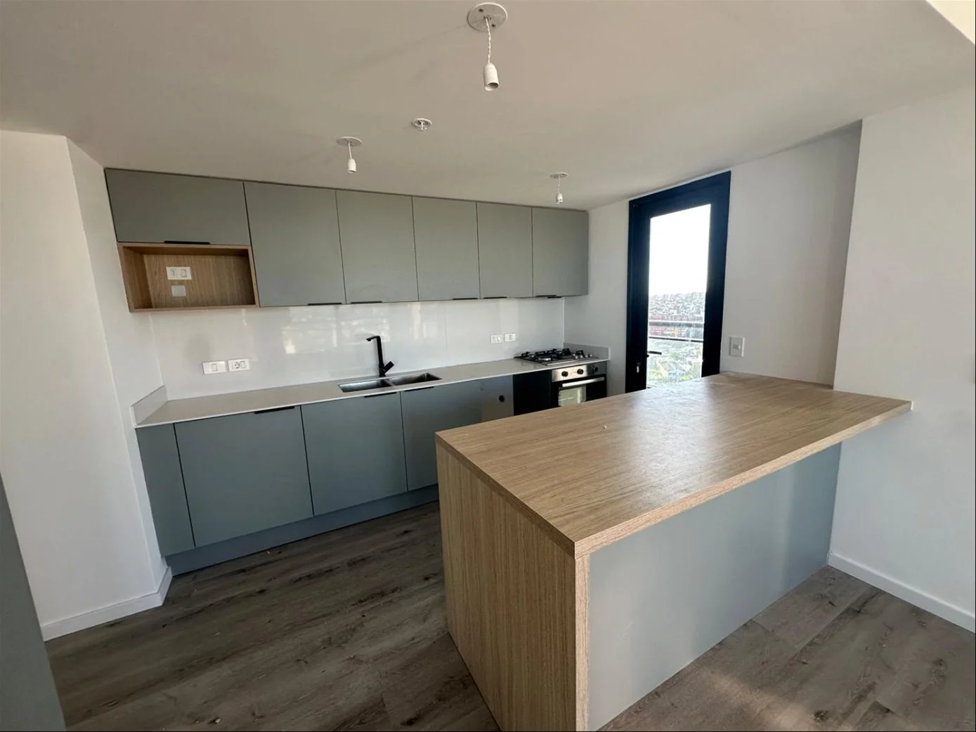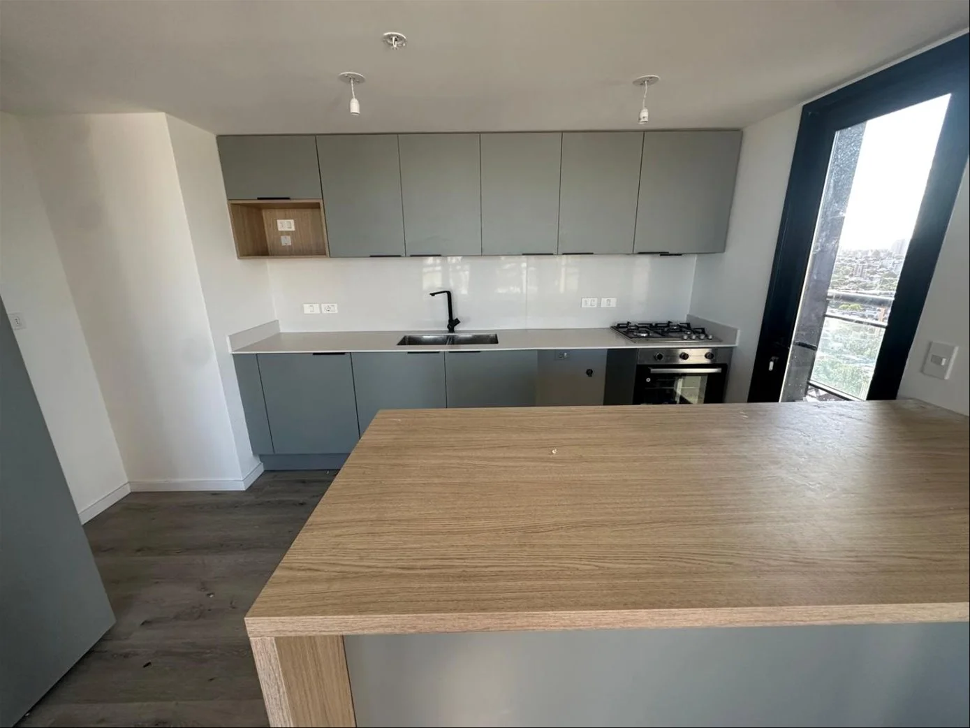 La cocina es integrada y se entrega con muebles aéreos y bajo mesada, equipada con anafe, horno de empotrar y campana de extracción.
