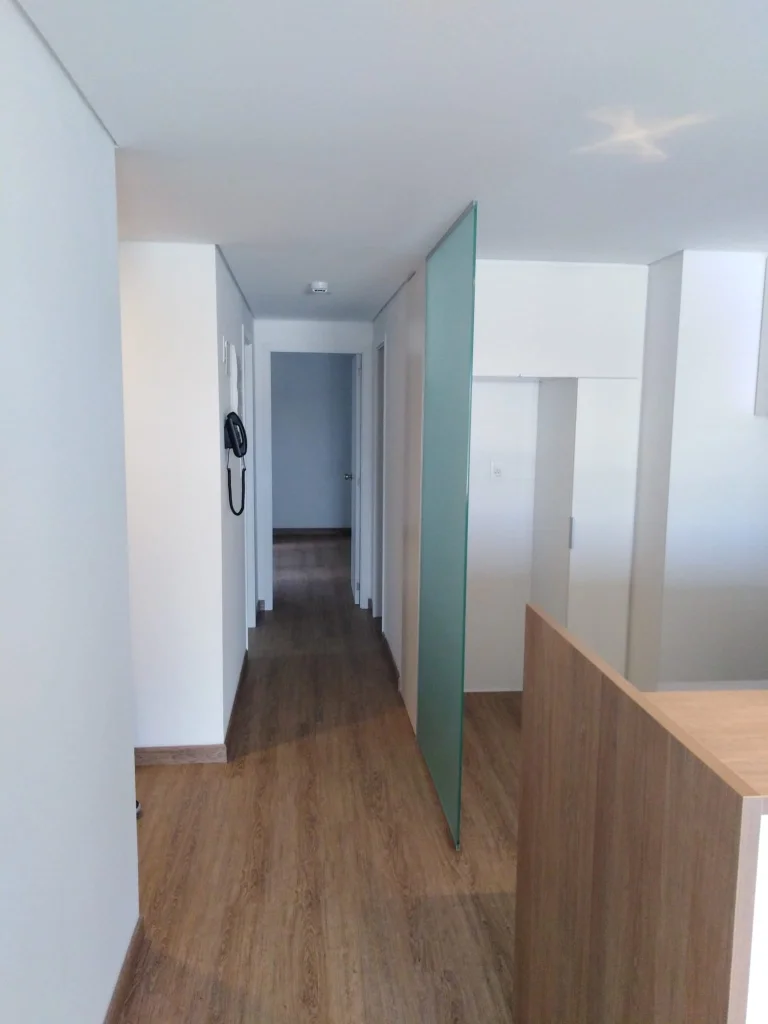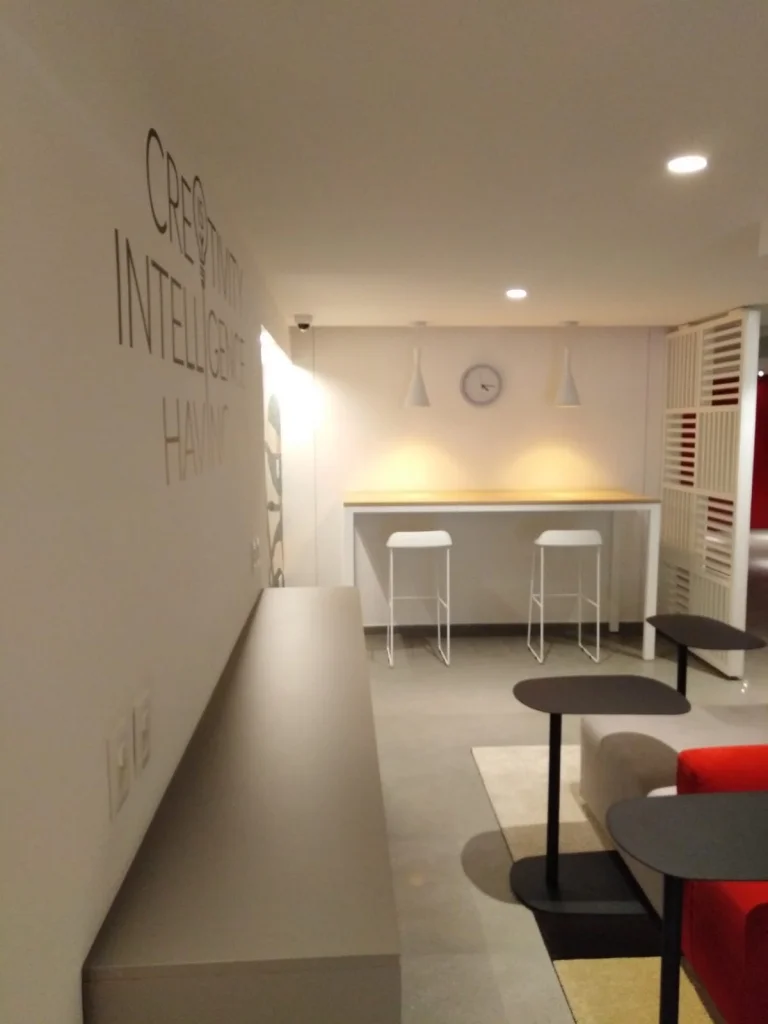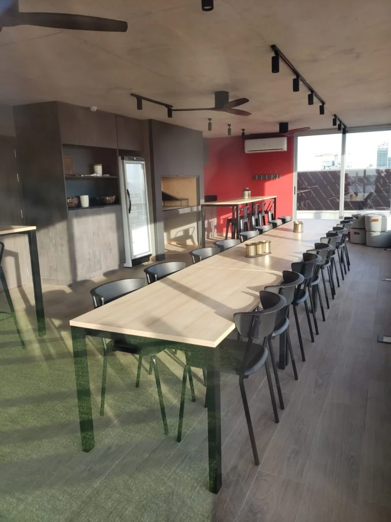 Lobby con zona de co- working con WI-FI. Aberturas y cortinas de enrollar en aluminio.