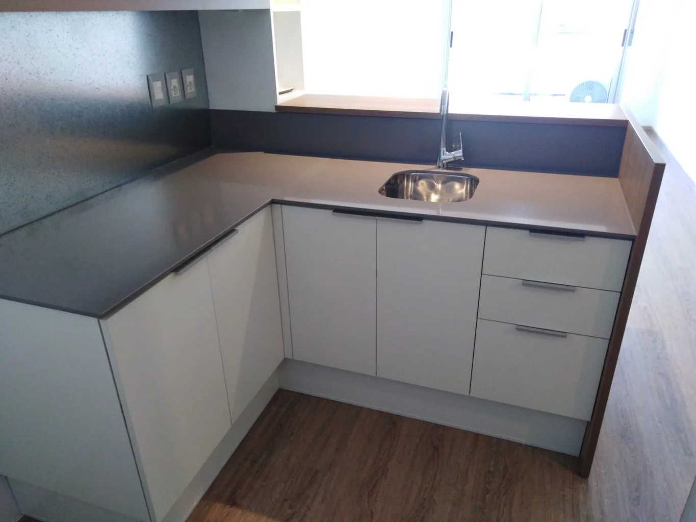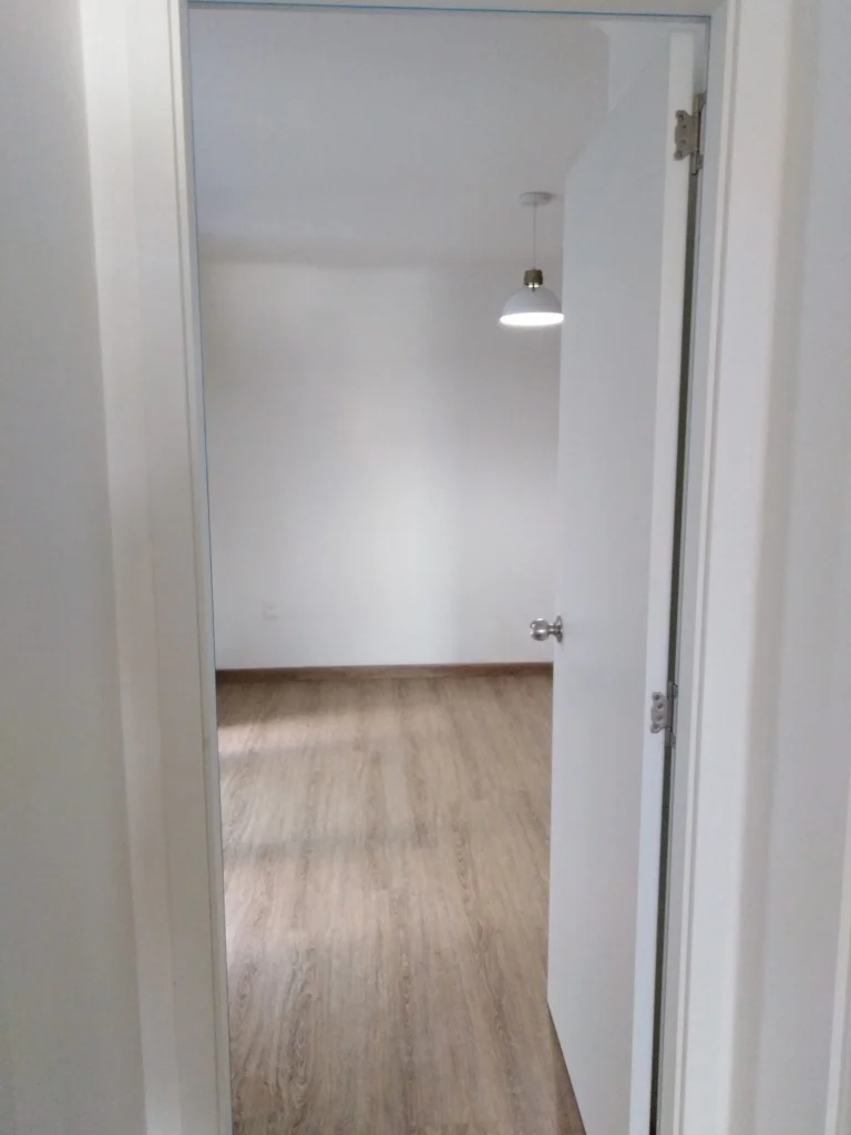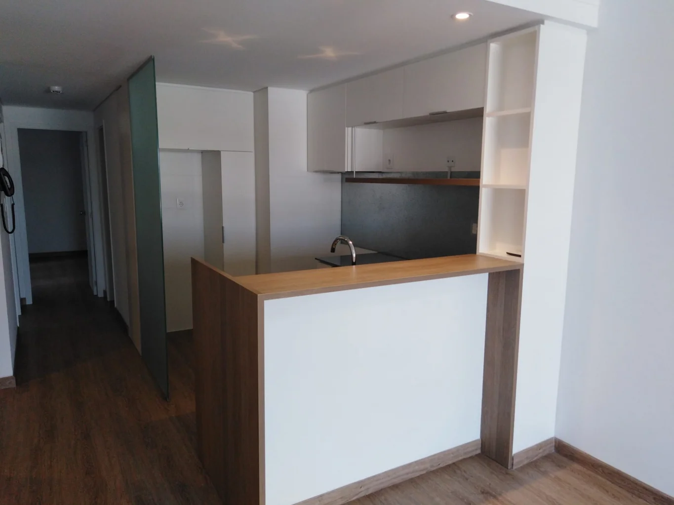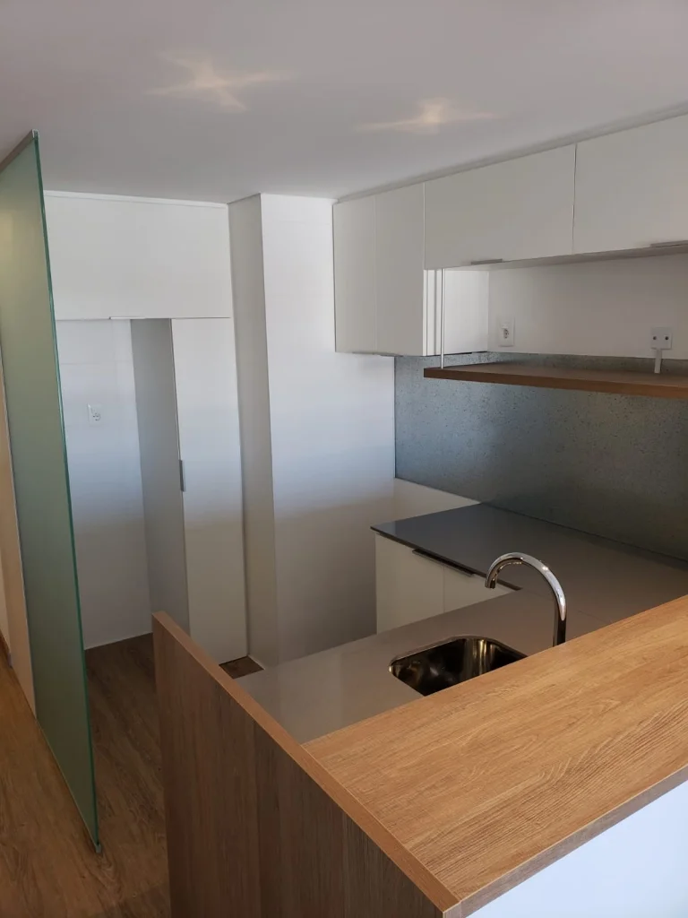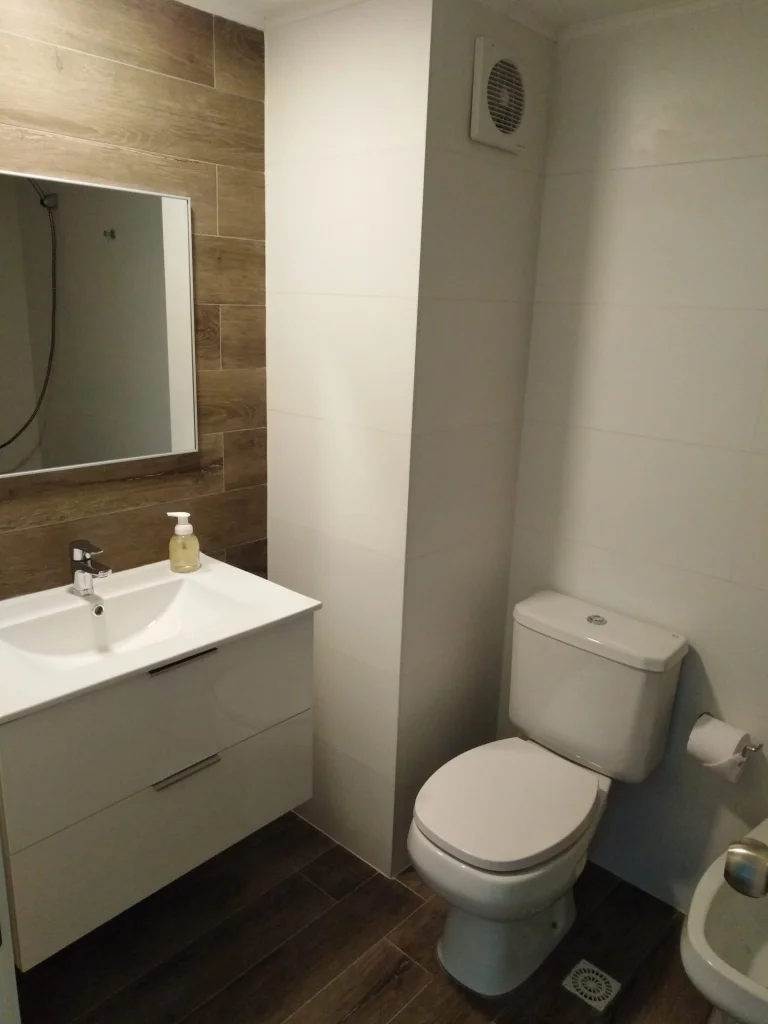 Cocina con varios placares, campana, espacio para garrafa bajo mesada. Tabique en vidrio opaco hacia el hall. Baño completo con calefón instalado y extractor de aire.