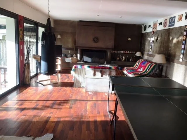 A nivel del fondo: Gran playroom con Estar, estufa a leña y salida al fondo. Cocheras y Garage.