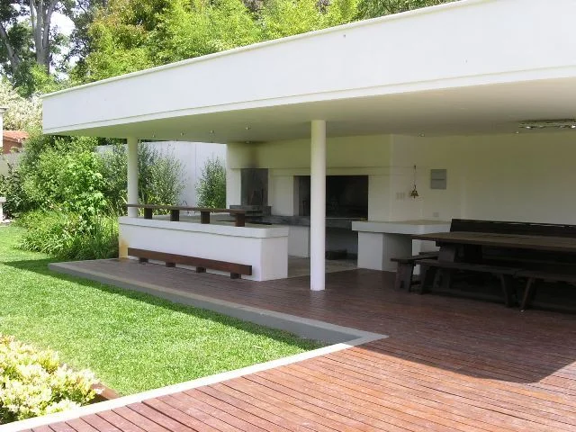 Barbacoa techada con parrillero, con un baño y ducha para la piscina.