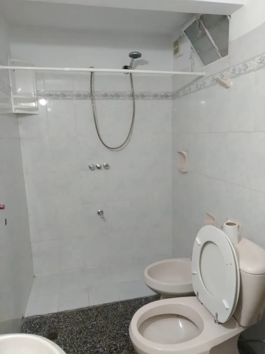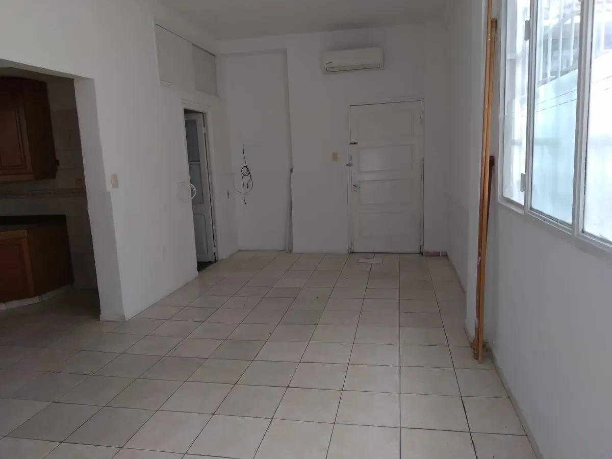 Amplio living-comedor con cocina integrada con placares bajo y sobre mesada, estufa y aire acondicionado.