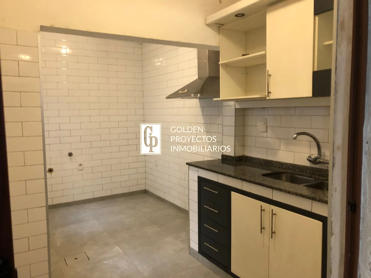 Cocina definida amplia y reciclada, con muebles bajo mesada, aéreos, campana y puerta y ventana al patio interior.