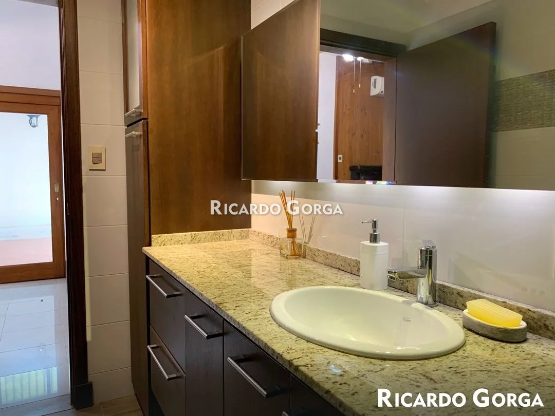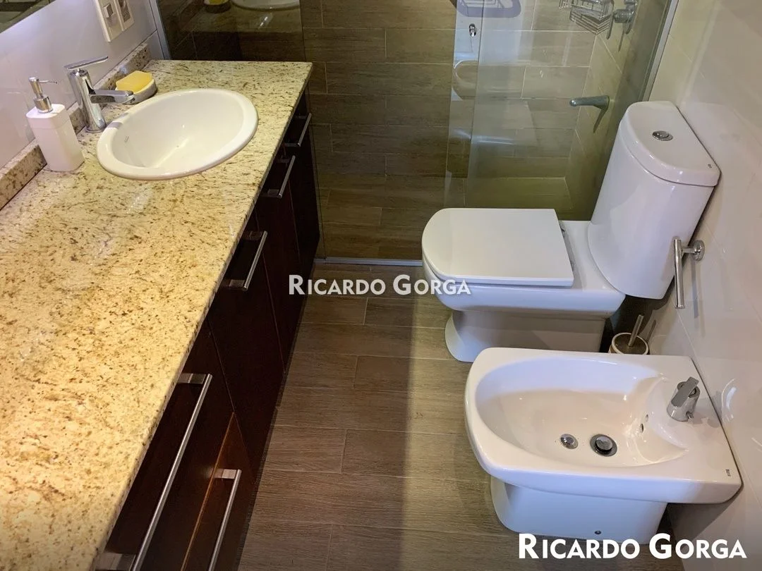Tiene 3 baños, 2 en la casa y uno en la barbacoa: el principal completo grande a nuevo con mampara, bacha con mueble, mesada de granito, grifería mono comando, espacio de guardado y ventilación al fondo. Losa sanitaria con inodoro mochila y bidé con grifería mono comando. Baño social chico con ventilación a patio interior. Tercer baño social moderno en la barbacoa.