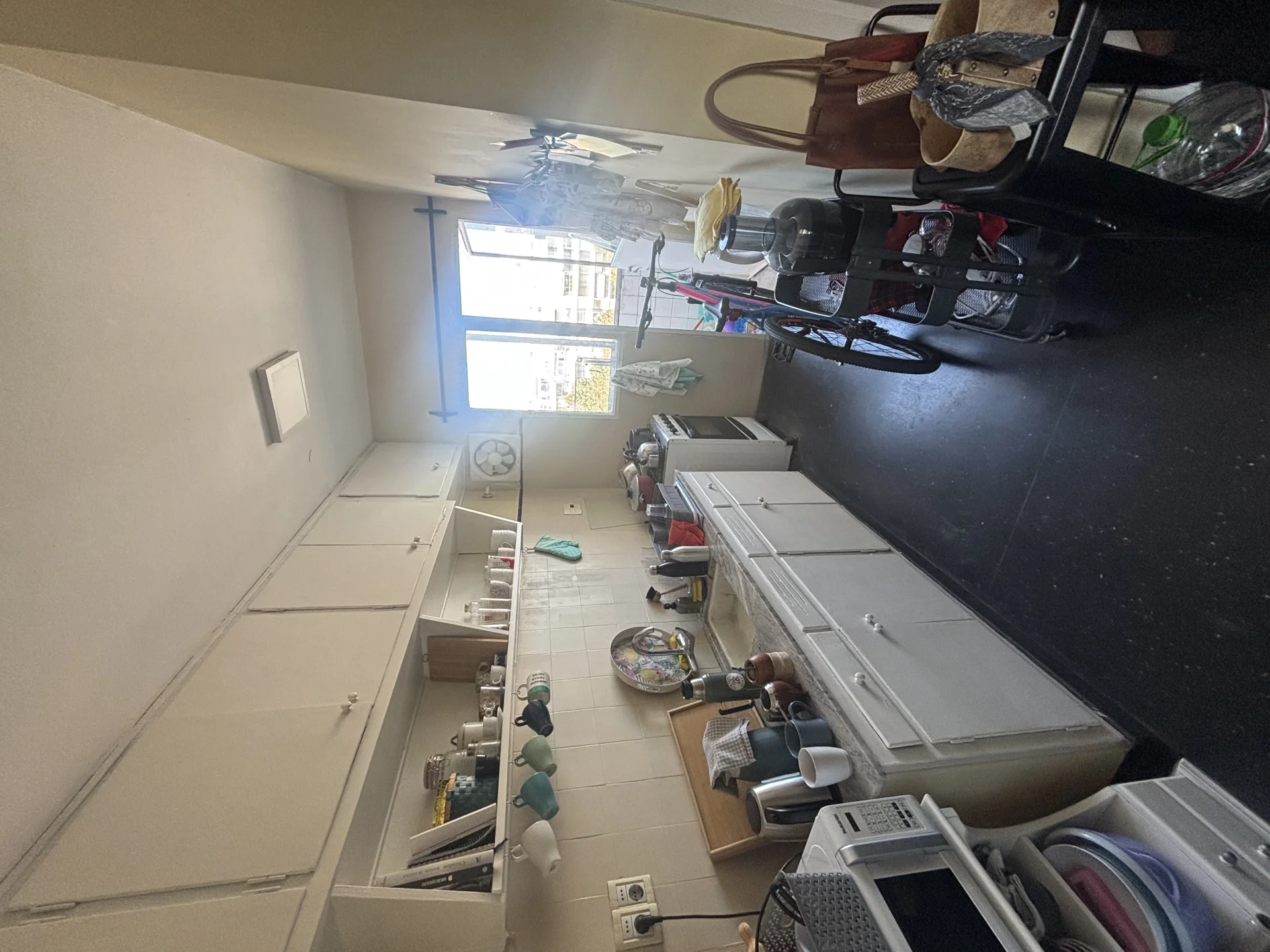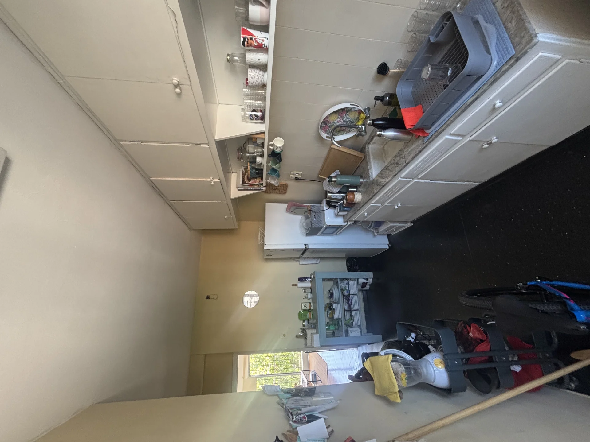 Cocina definida de época con placares bajo y sobre mesada con terraza lavadero y conexión para lavarropa .