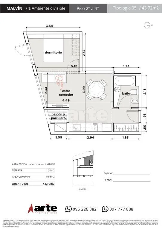 Divino loft, transformable en un dormitorio con parrillero propio, a metros de la rambla. Amplio ambiente divisible con cocina integrada y terraza con parrillero. Edificio de moderno diseño con excelente calidad constructiva, muros de mampostería tradicional, preinstalación de aire acondicionado, aberturas con DVH. Además contará con cerramiento perimetral, previsión de CCTV, laundry, área de tender, parrillero abierto y bicicleteros.