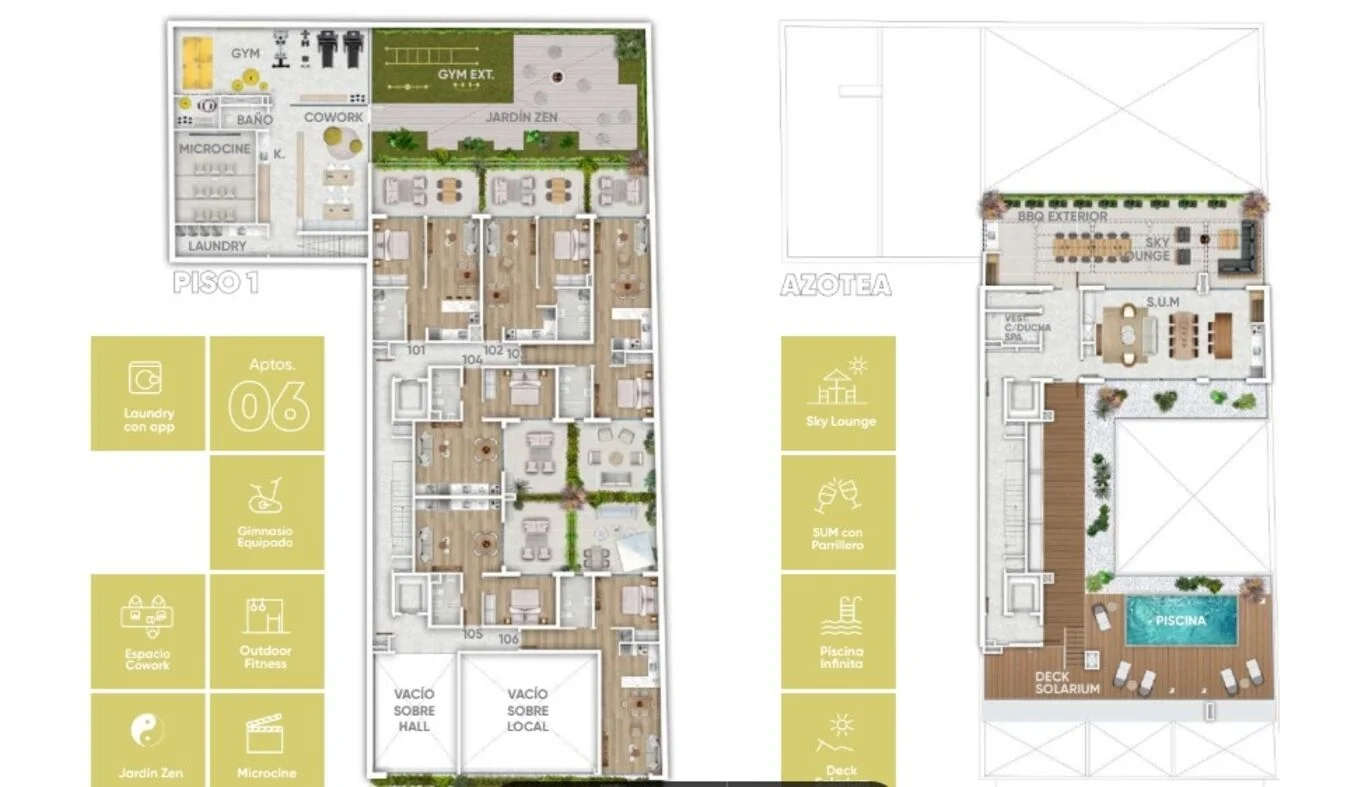 Además proporcionará a todos sus habitantes la posibilidad de sentirse como en un resort, en su propio hogar ya que contará con un gran numero de exclusivas amenities: SUM con parrillero, piscina infinita, deck solárium, gimnasio equipado, sky lounge, co-work, outdoor fitness, jardín zen, microcine, área de bicicletas, locker room y conexión autos eléctricos.
