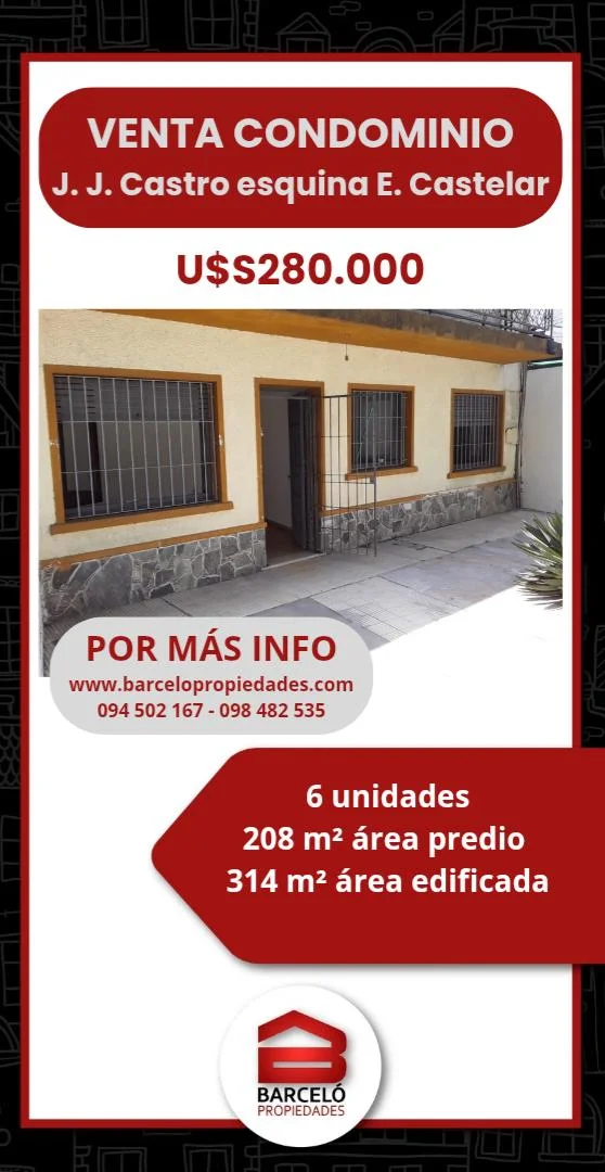 Edificio ubicado en la calle Juan José Castro esquina Emilio Castelar, en el barrio La Unión. Esta propiedad en venta ofrece una excelente oportunidad de inversión a un precio de U$S280.000. El predio es de 208 m² y el área edificada es de 314 m².
