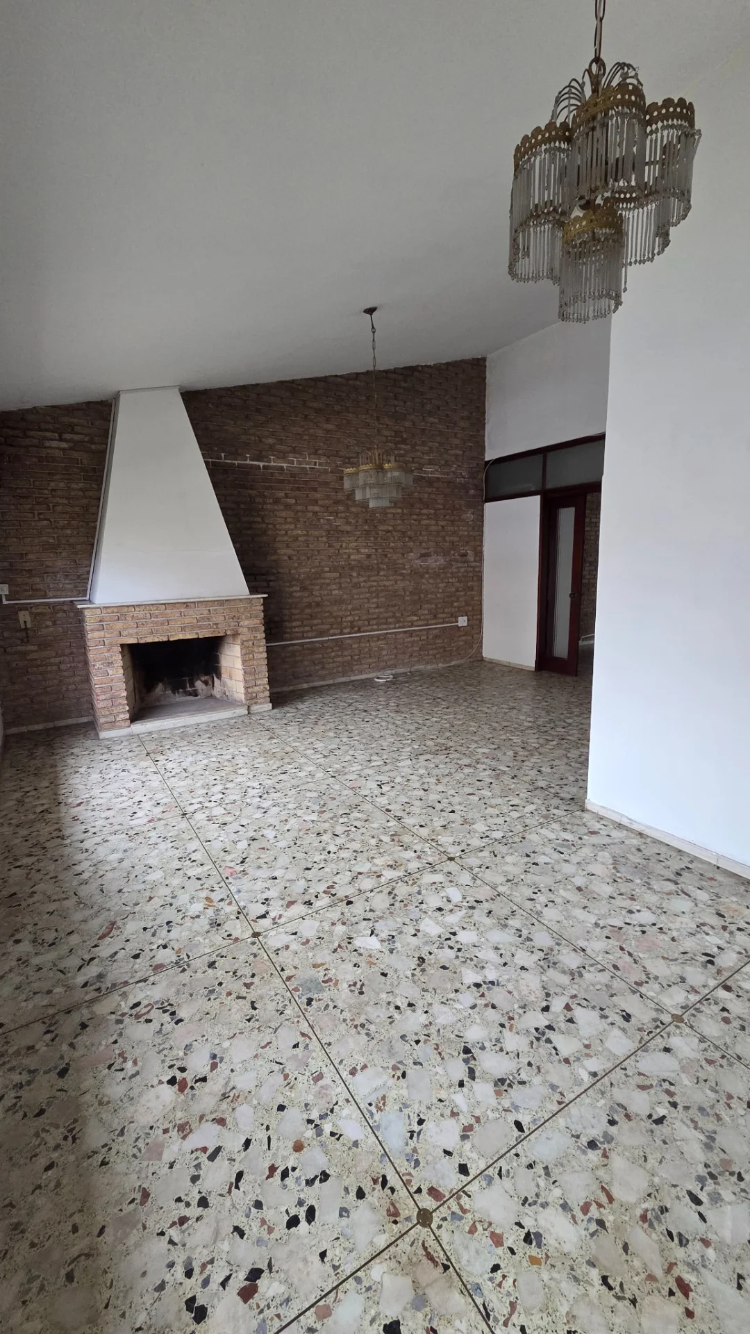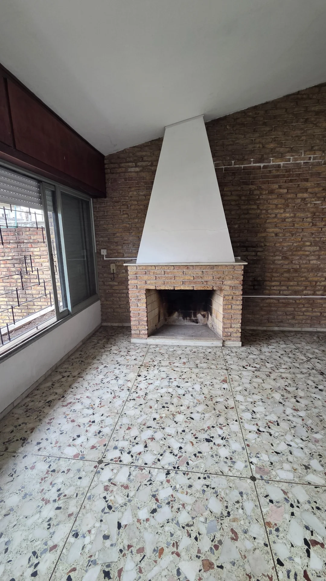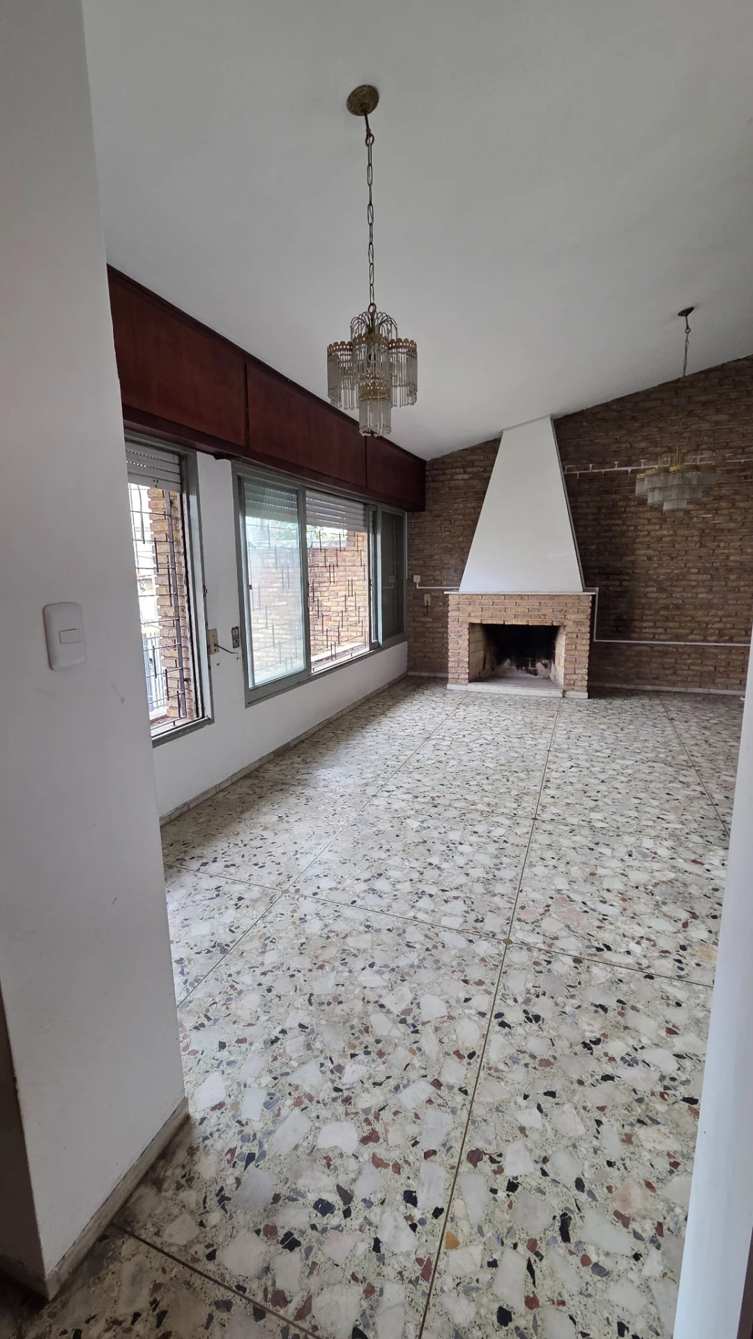Ingrese a un espacioso y luminoso living comedor realzado por una pared de ladrillo visto y una funcional estufa a leña que invita a la relajación.