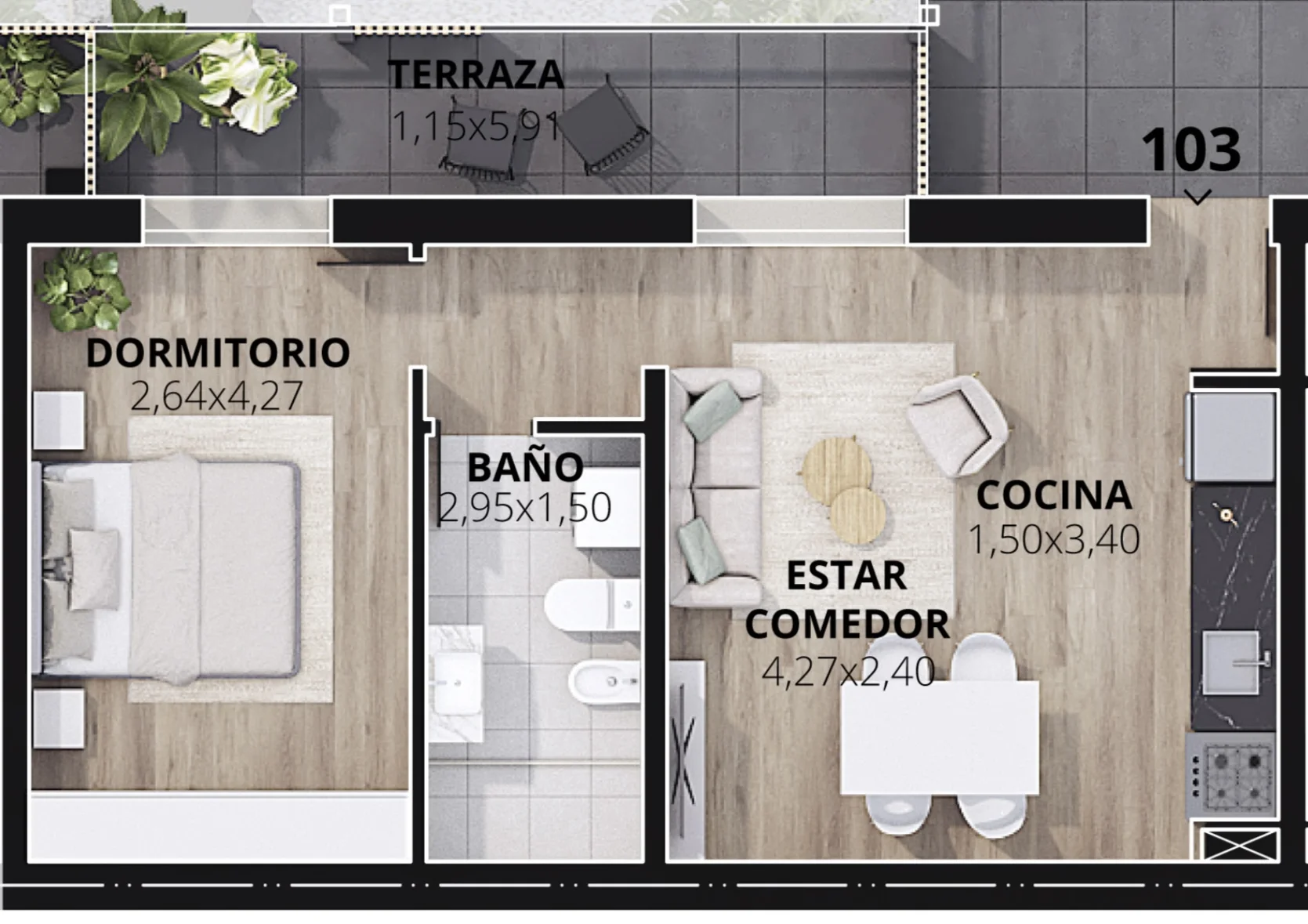 La unidad se desarrolla sobre 41 m2 totales, distribuidos en living comedor con cocina integrada, cómodo dormitorio y baño completo.