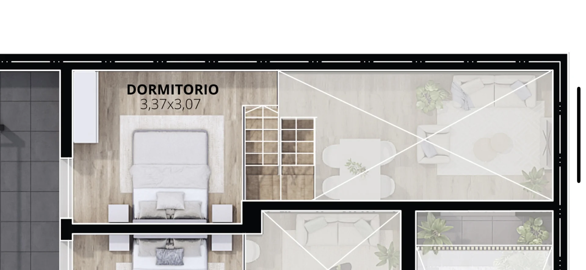 La unidad se desarrolla sobre 47m2, incluyendo terraza en el apartamento y azotea de 28 m2 de uso exclusivo.