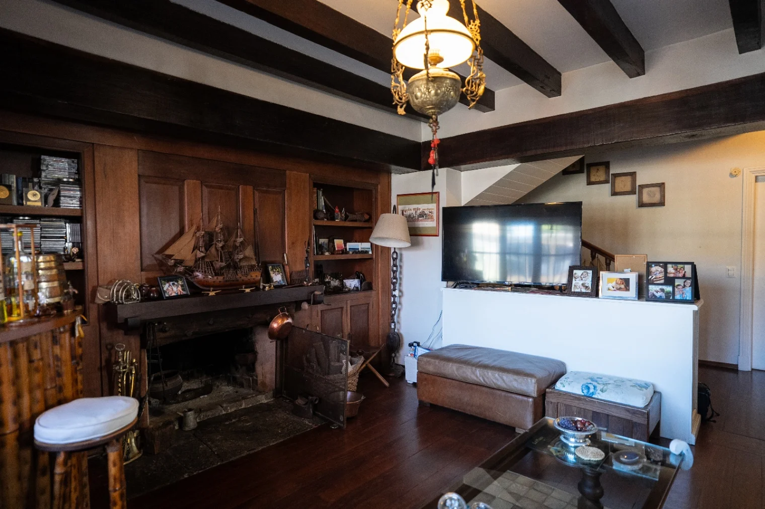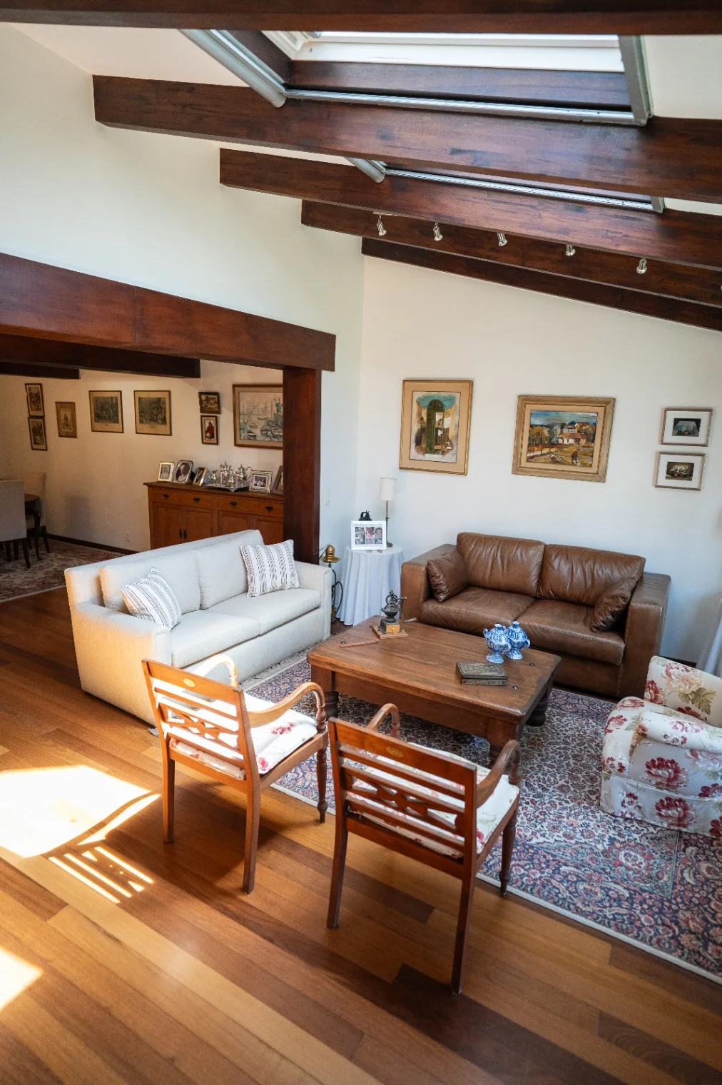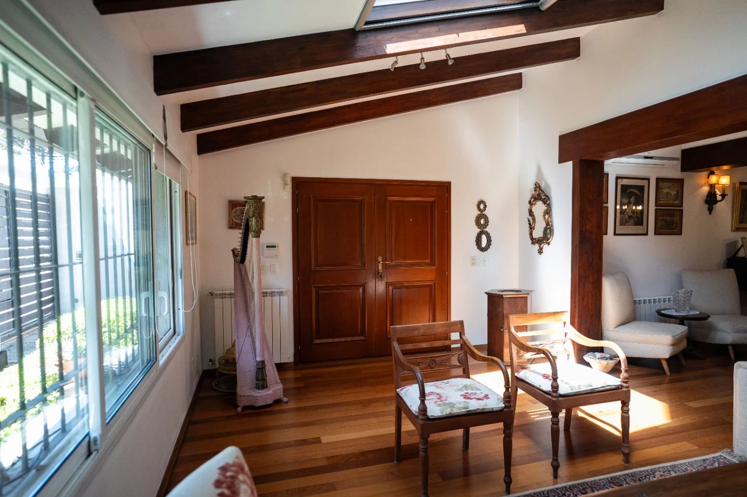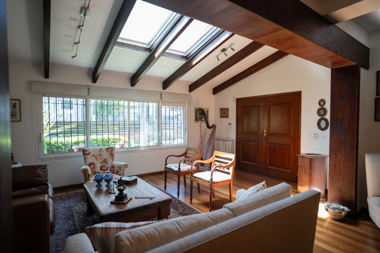 En su planta baja se permite un cálido acceso mediante puerta de cedro en dos aguas hacia un amplio living comedor con pisos de Lapacho y techo con pilares de Jatobá, en excelentes condiciones y con excepcional luminosidad gracias a un lucernario de apertura eléctrica con cortina manual. Cómoda cocina, también extremadamente luminosa, con mesada de mármol y generoso espacio de almacenamiento, conectada a un dormitorio de servicio con baño propio. En este nivel se encuentra también un toilet social y un lavadero en el espacio que vincula el salón principal con una segunda sala multifuncional.