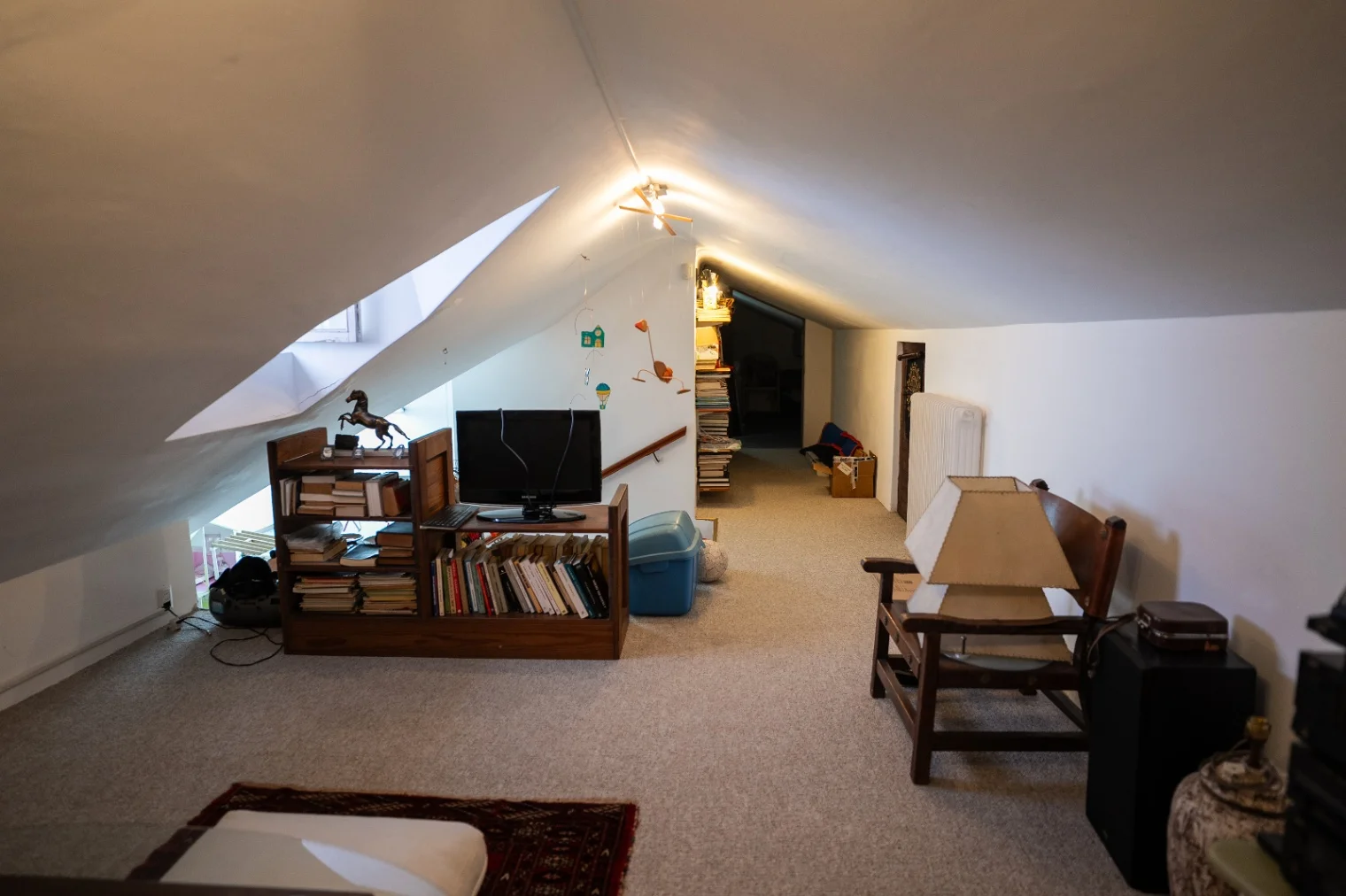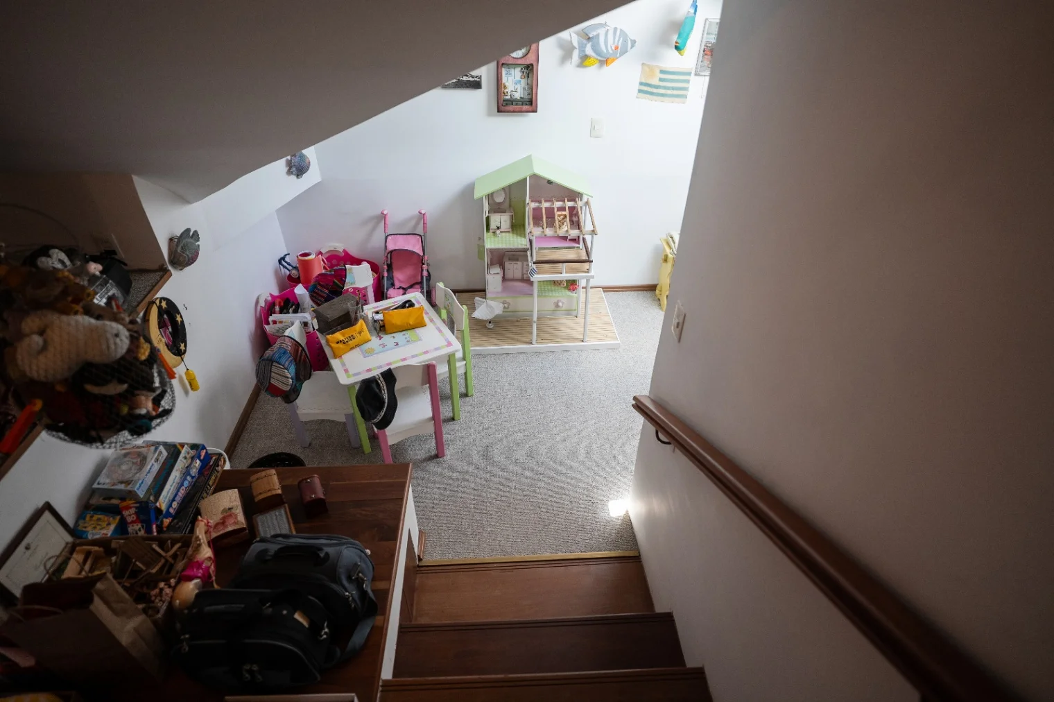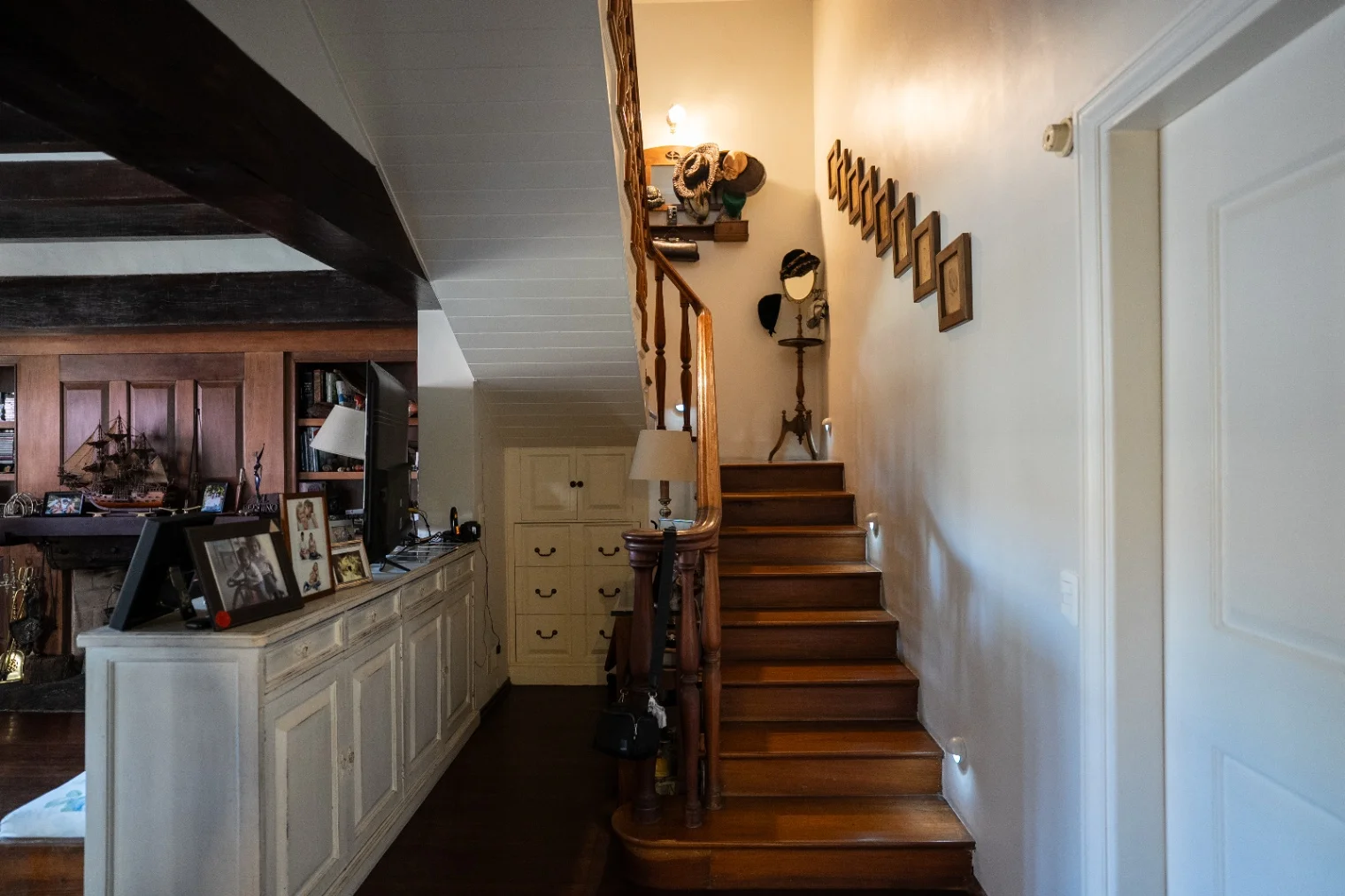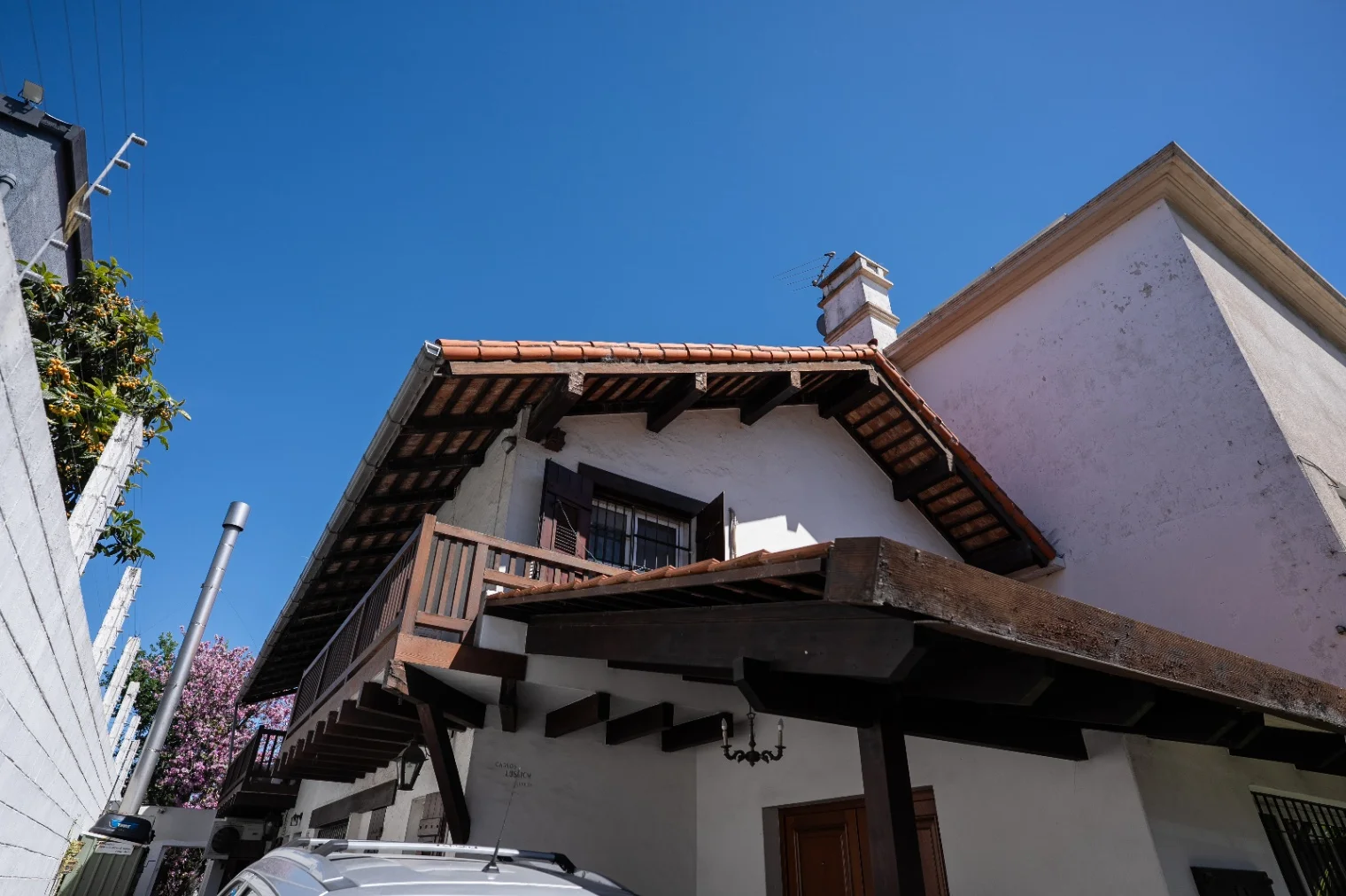 En su planta alta se desarrolla mediante una escalera de Cedro Libanés que conduce a tres dormitorios con cómodos balcones recubiertos en madera, ventanales de aluminio con rejas y postigones de madera. En su dormitorio principal se permite acceso a un amplio y cómodo vestidor y acceso a un baño en suite completo con finas terminaciones al que puede accederse también del espacio de circulación de su planta alta. Un segundo baño completo se ofrece a su lateral también excelente estado de conservación, así como un pequeño espacio de juegos para niños y un amplio altillo de guardado.