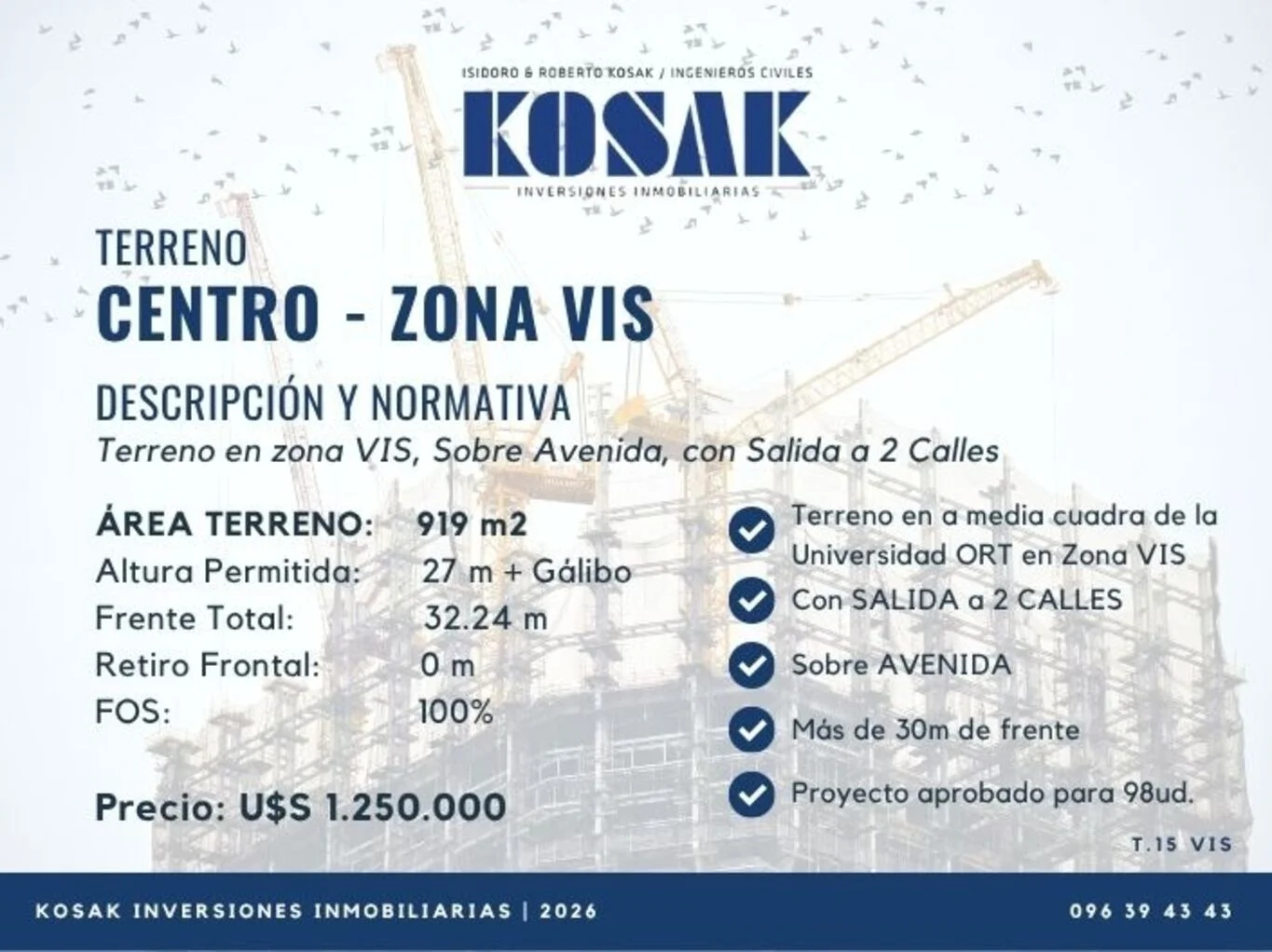 KOSAK INVERSIONES INMOBILIARIAS - TERRENOS Terreno con frente sobre dos calles, frente a Universidad ORT Centro. Con proyecto aprobado para construir 98 unidades. Área total: 919m2 Altura Permitida: 27m + Gálibo Retiro Frontal: 0m FOS: 100% Frente A: 10.74m Frente B: 21.5m Por consultas comunicarse con Arq. Valentina Kosak - ***