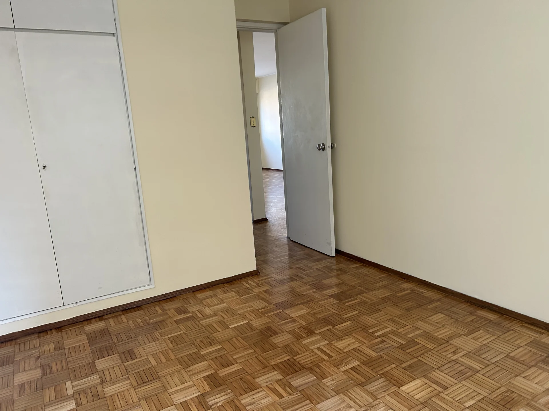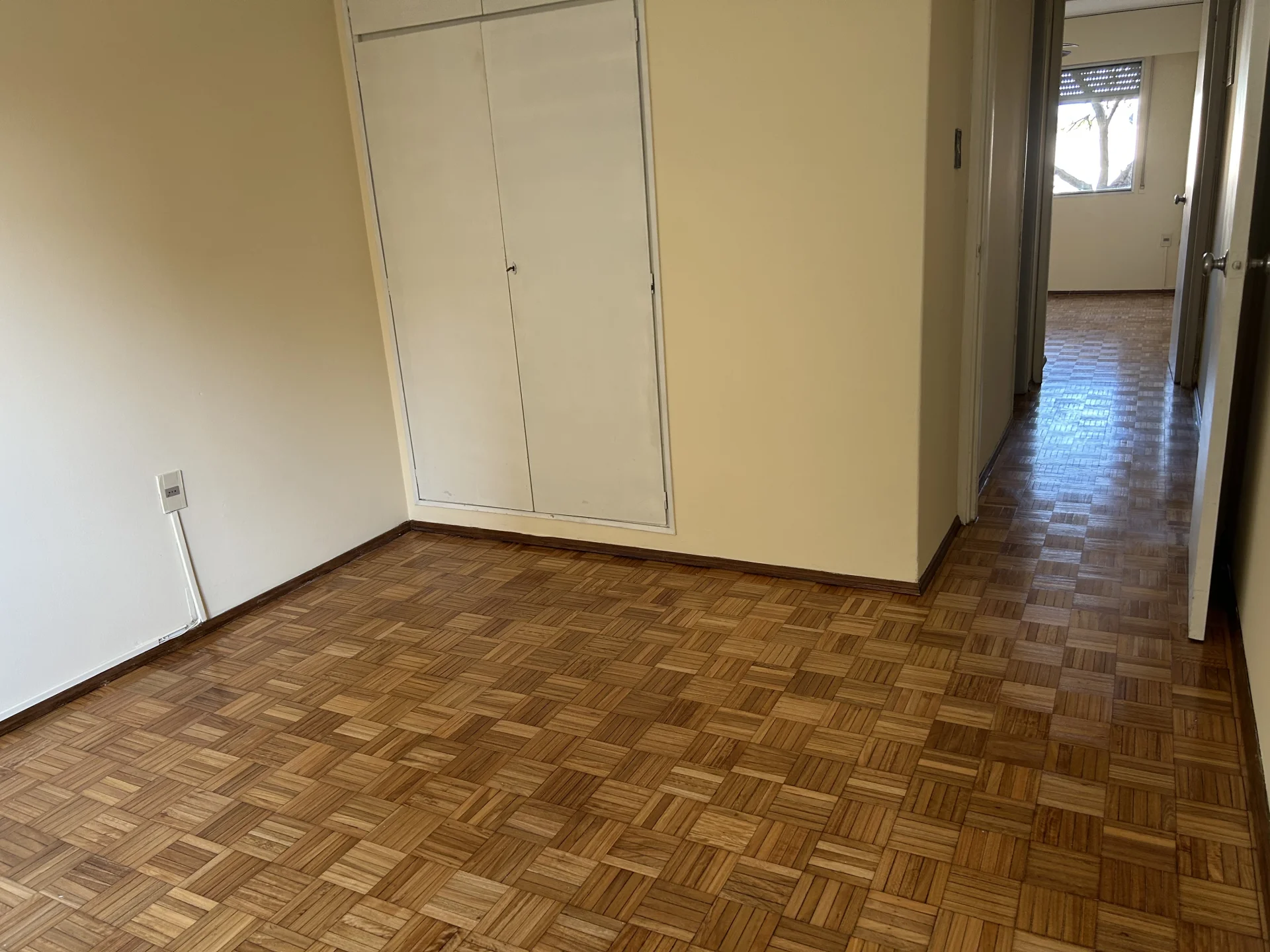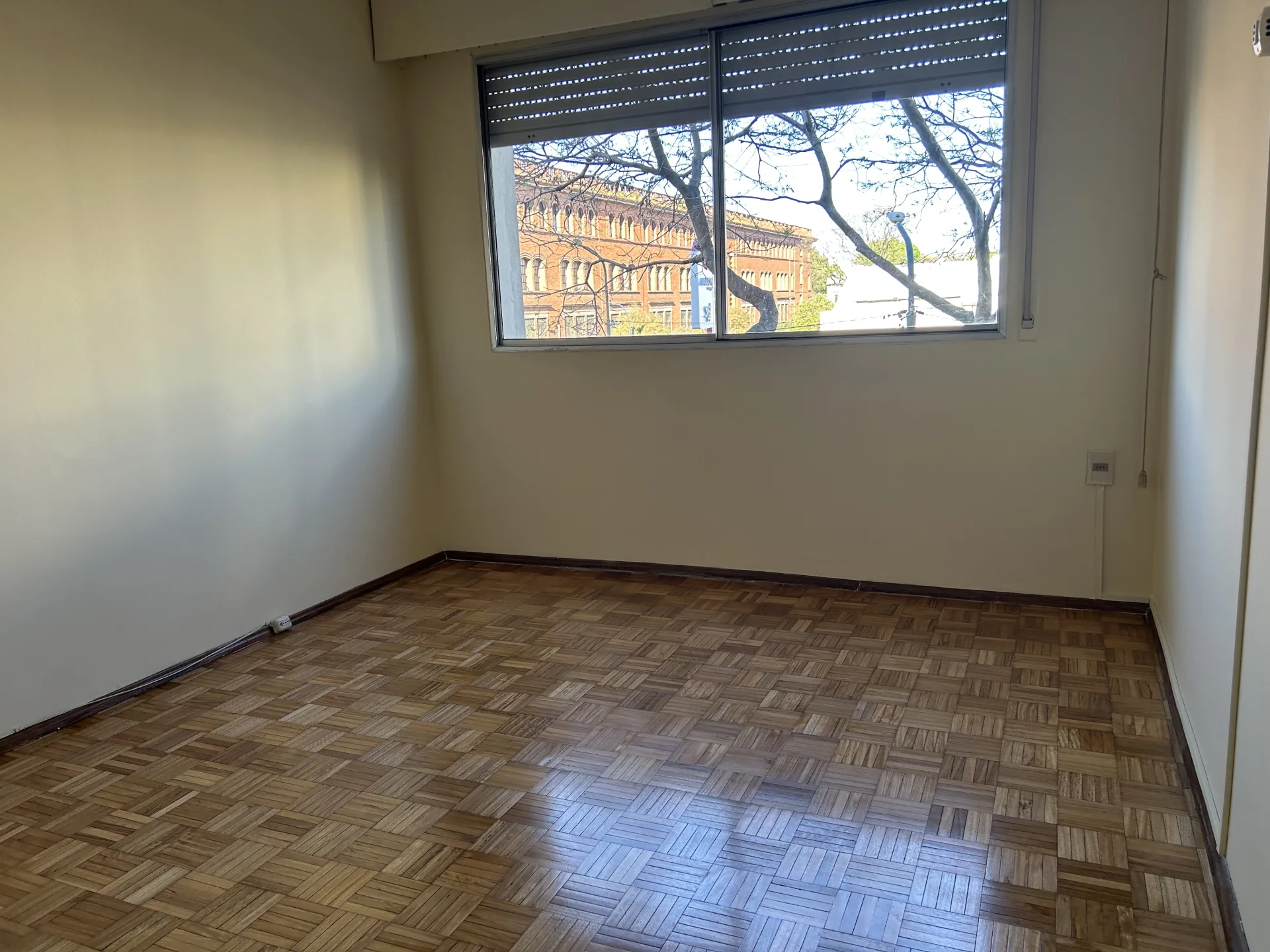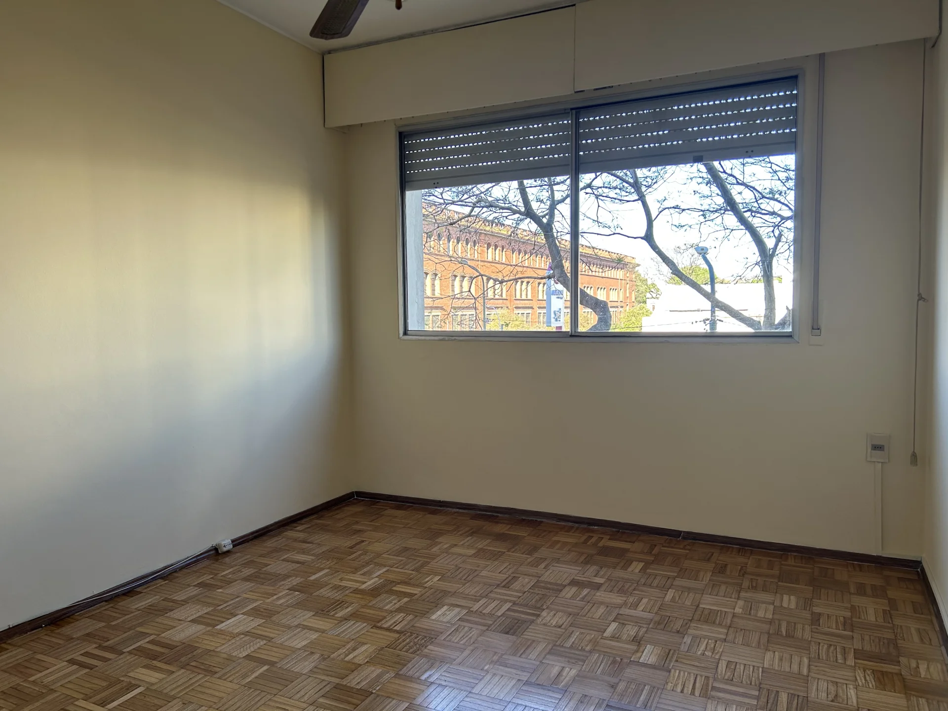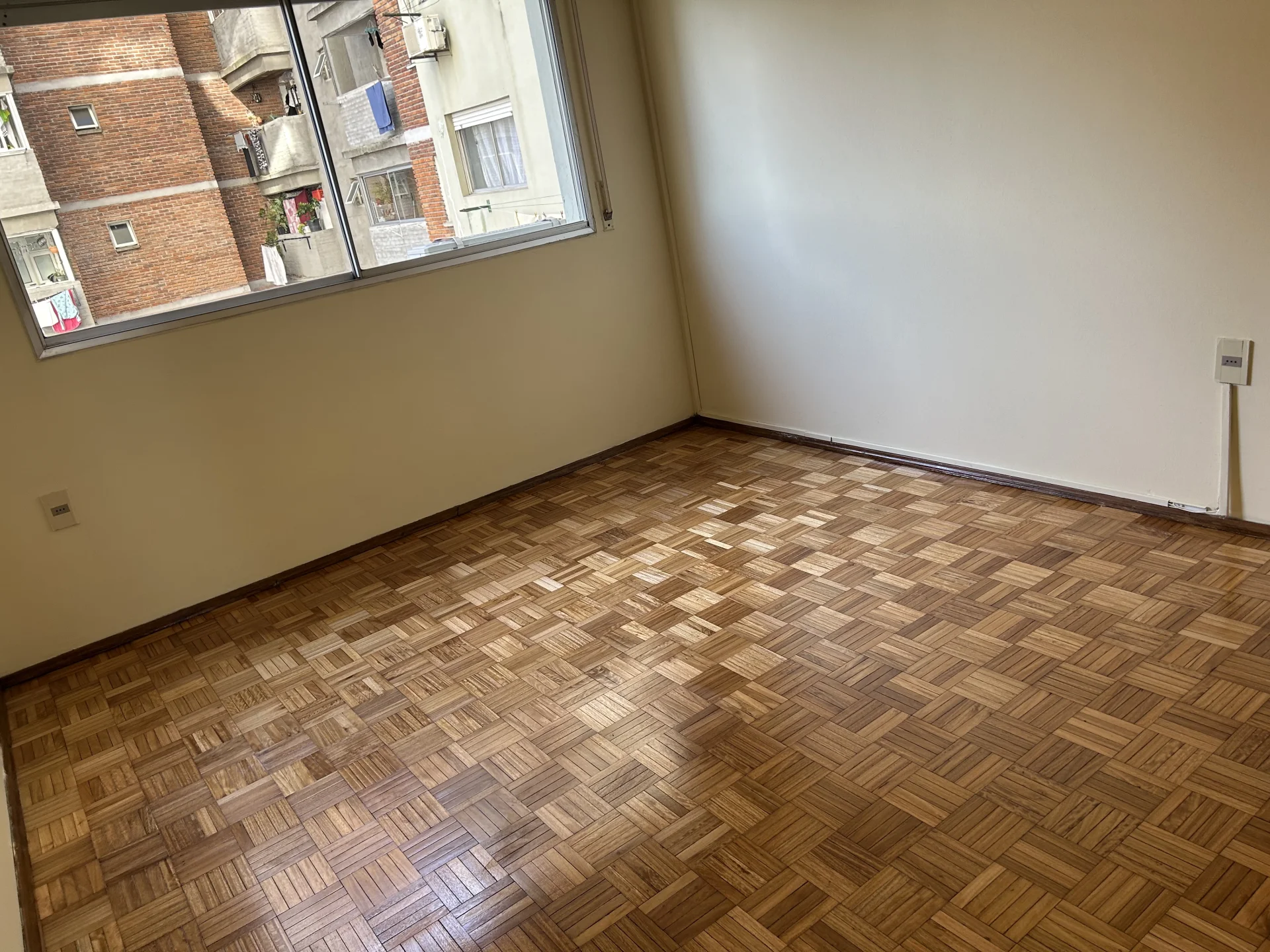 El apartamento cuenta con dos dormitorios, ambos equipados con placares. El dormitorio principal está orientado hacia el frente, con ventanal y persiana de enrollar; el segundo dormitorio es contrafrente y dispone de aire acondicionado. El baño completo presenta buenas dimensiones y se encuentra revestido en cerámica.