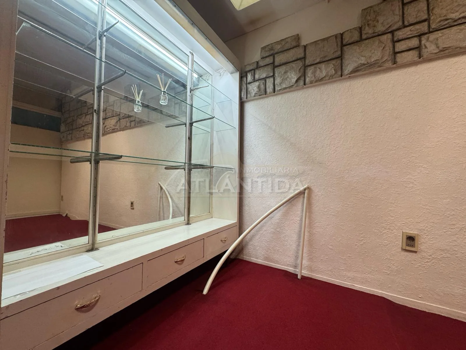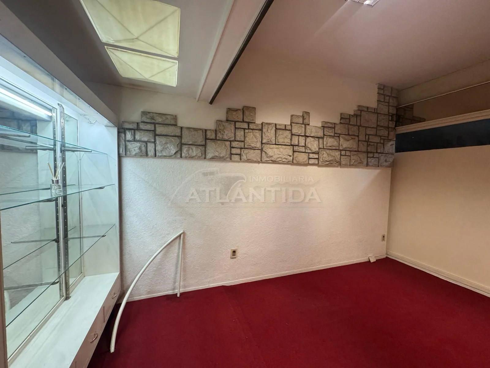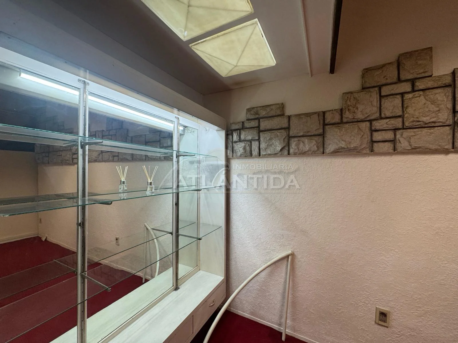 - Ambiente muy luminoso, con mobiliario para exhibición, paredes revestidas en simil piedra decorativa y moquet en excelente estado.