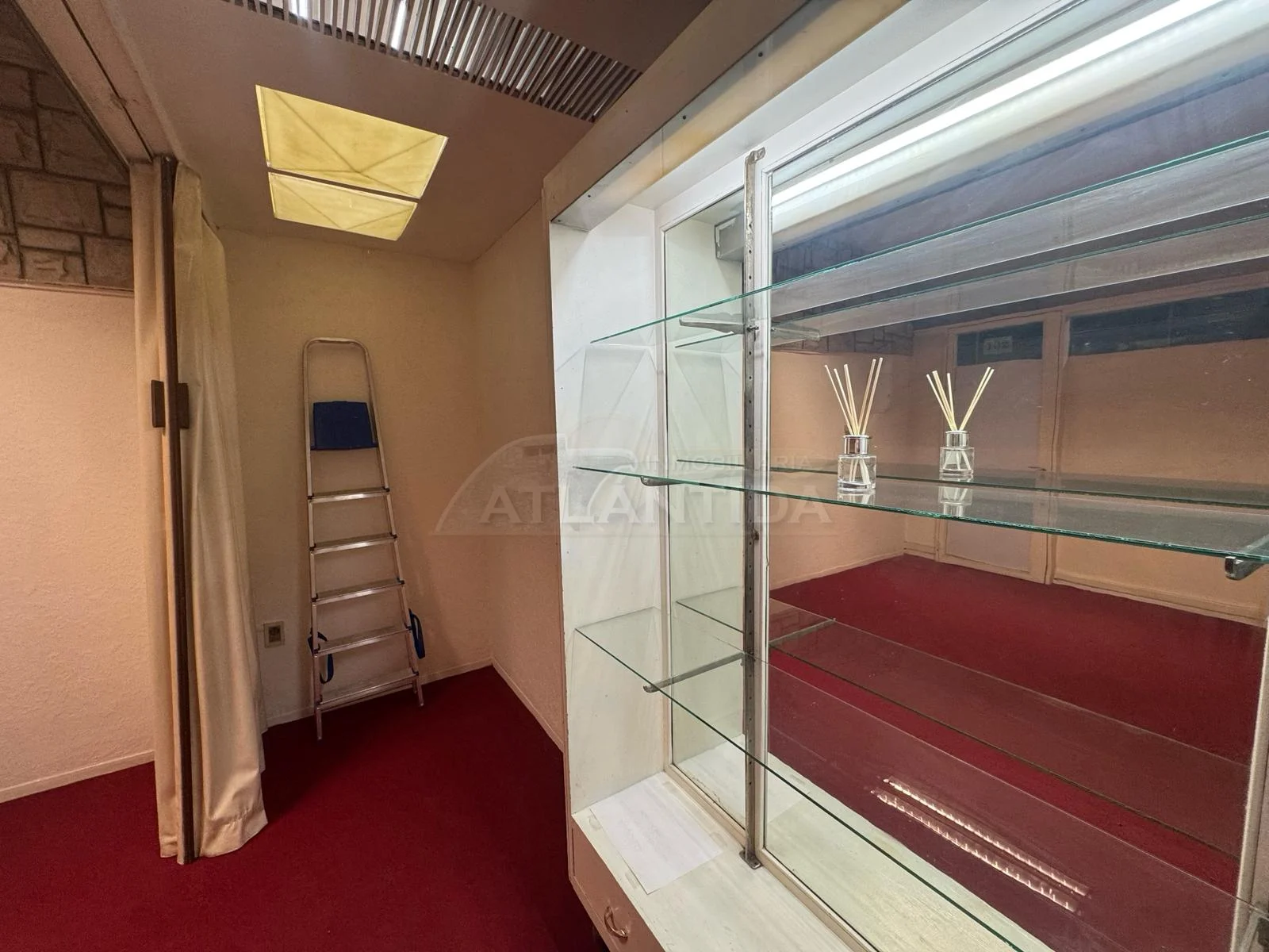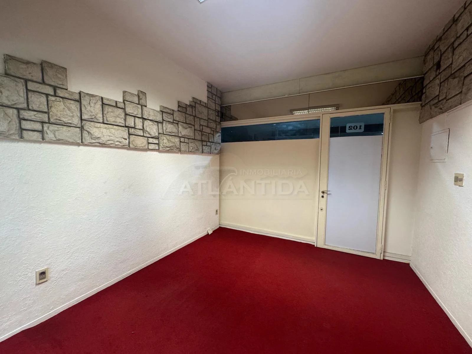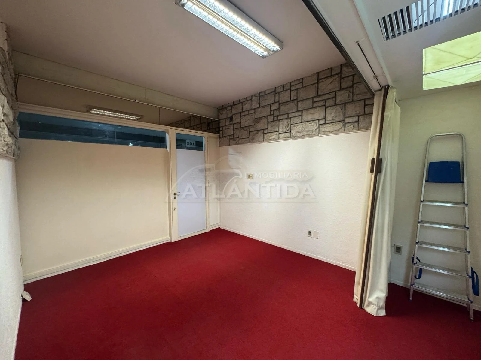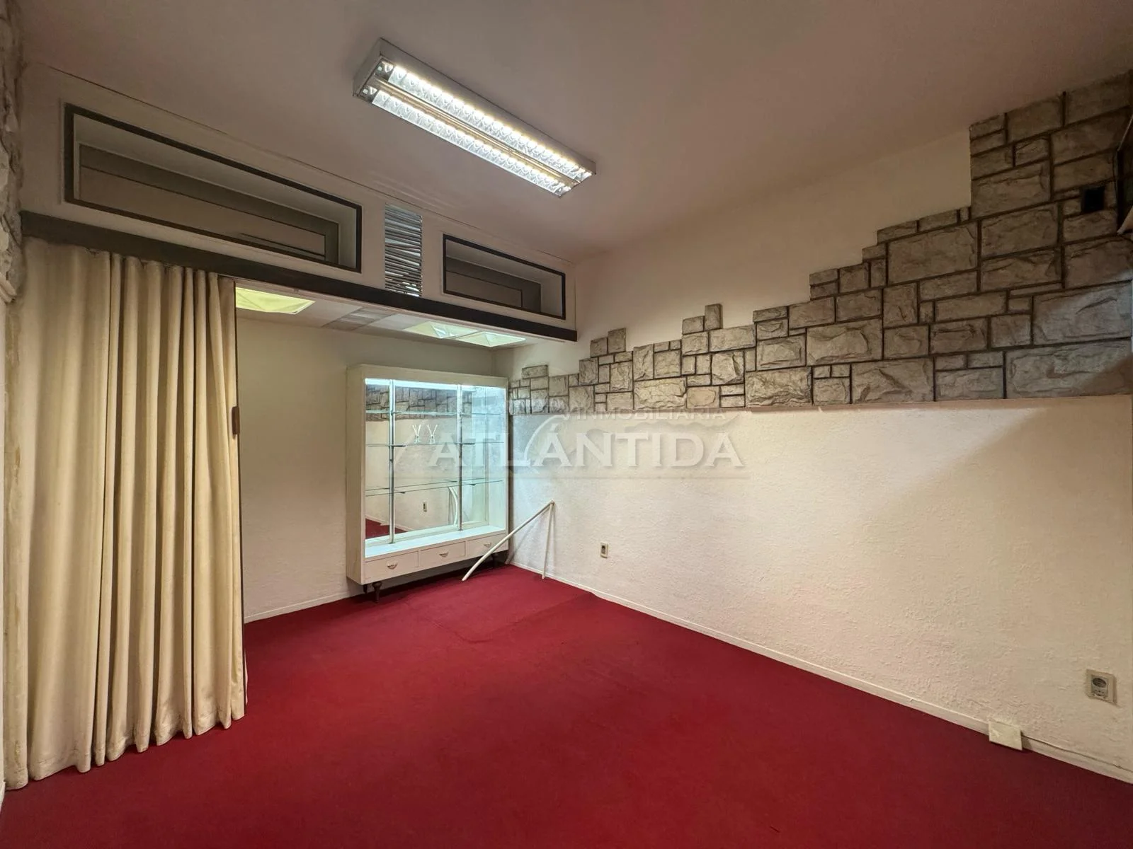 - Ambiente muy luminoso, con mobiliario para exhibición, paredes revestidas en simil piedra decorativa y moquet en excelente estado.