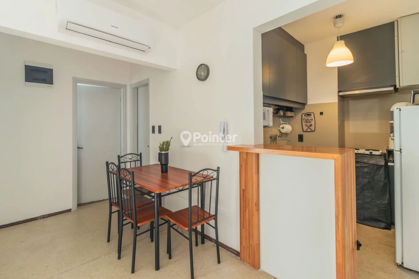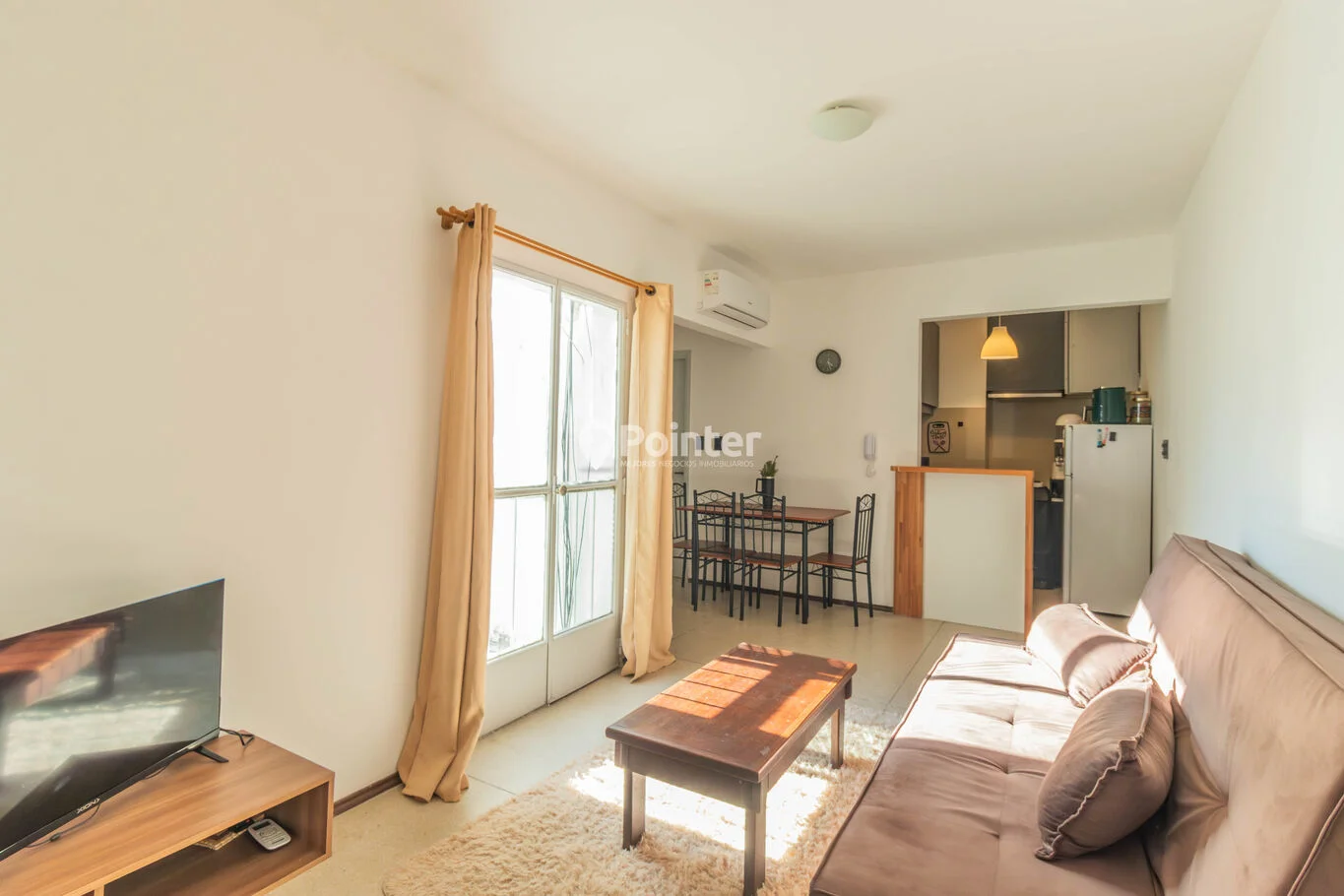 Ambiente principal muy luminoso y ventilado gracias a una ventana de dos hojas con balcón estilo francés de apertura total. Cuenta con aire acondicionado y se integra con la cocina.