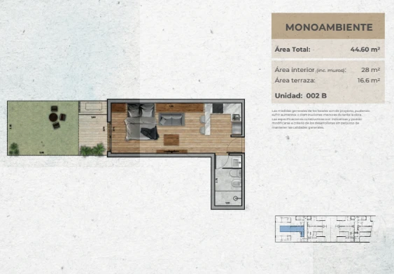 inmobiliaria cauduro vende, muy buen apartamento mono ambiente, en planta baja con patio de uso exclusivo, orientado al corazón de manzana.