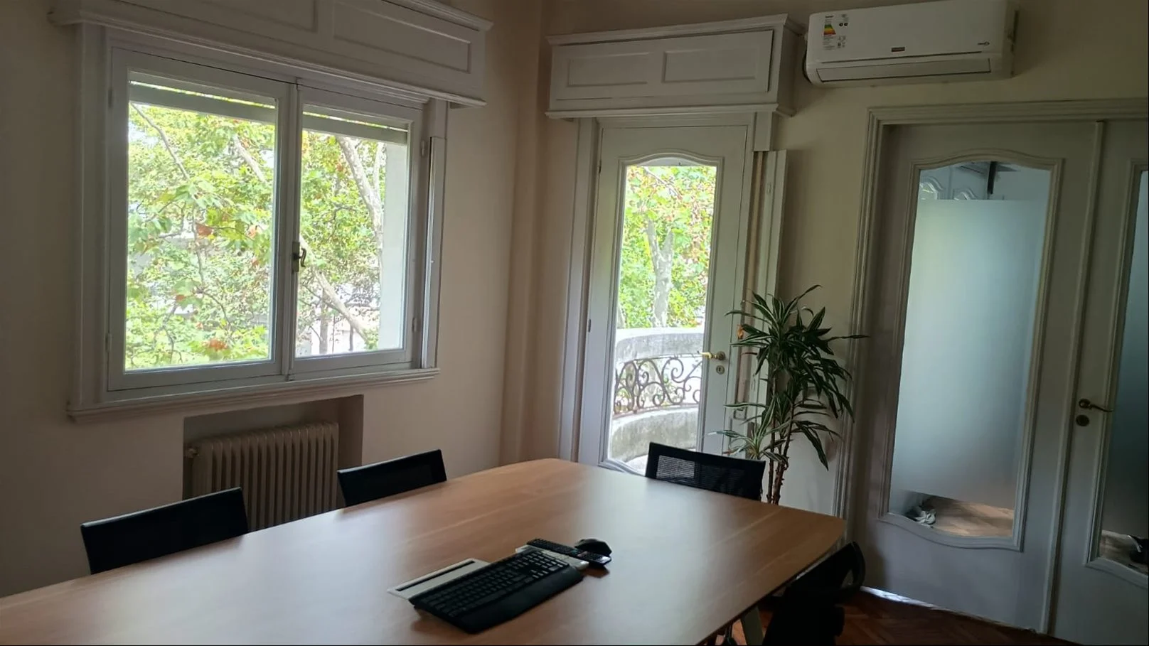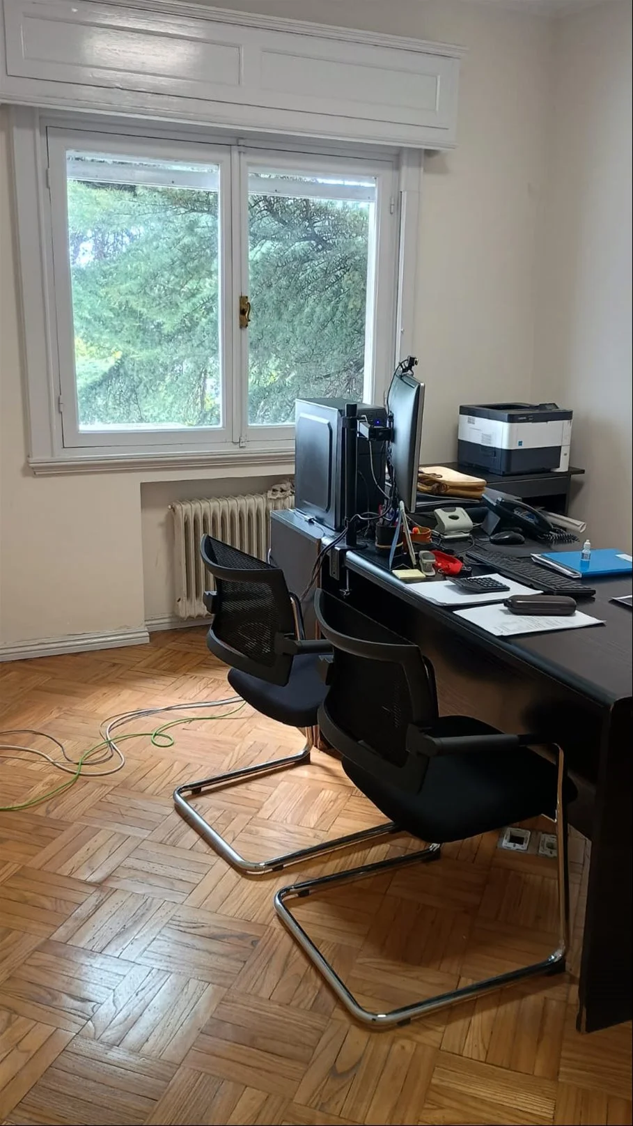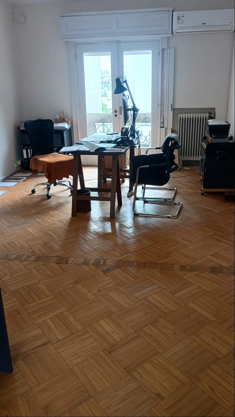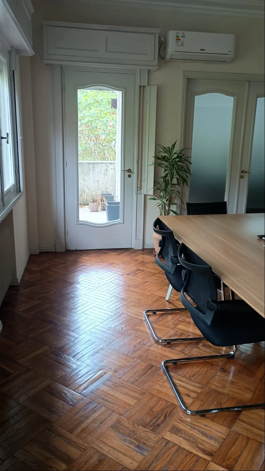 La unidad Sala de reuniones o amplio espacio de trabajo al frente con doble acceso y salida a balcón, 4 privados, uno con acceso directo y otro con lugar para varios espacios de trabajo y salida a segundo balcón, 2 baños a nuevo, cocina con placares bajo mesada con lugar para utilizar como comedor y varios placares en los pasillos o áreas comúnes. .