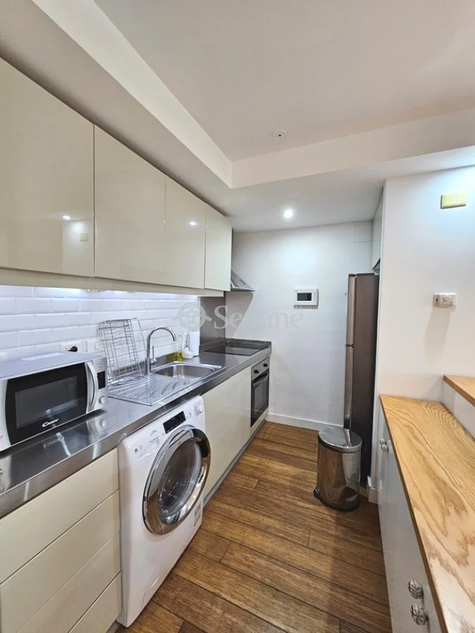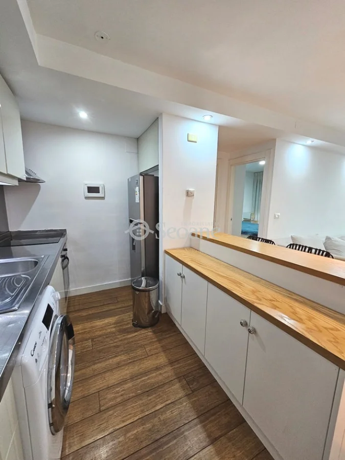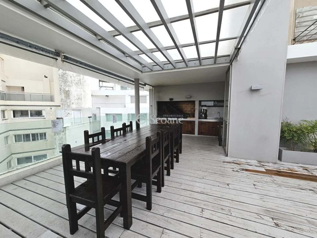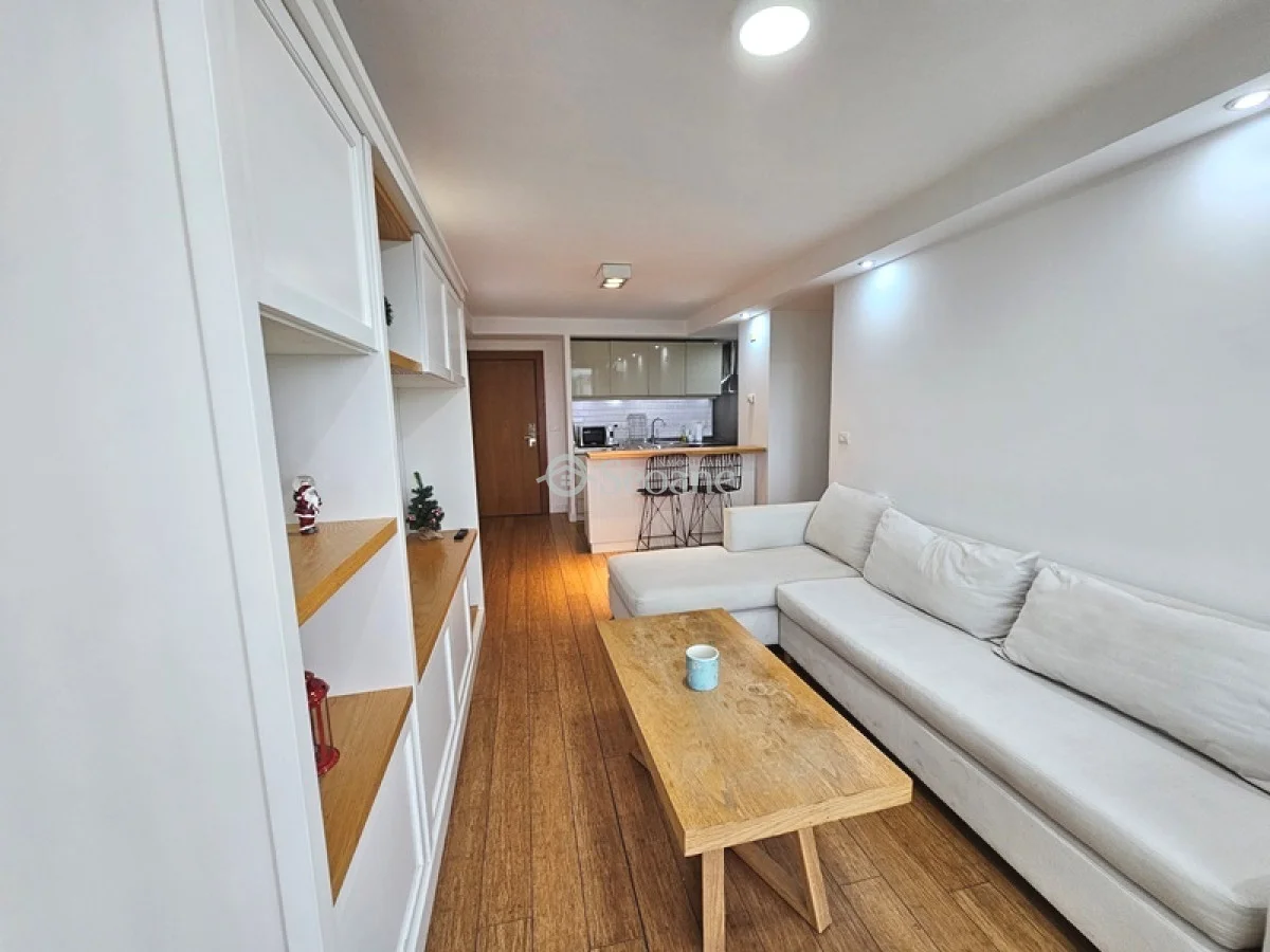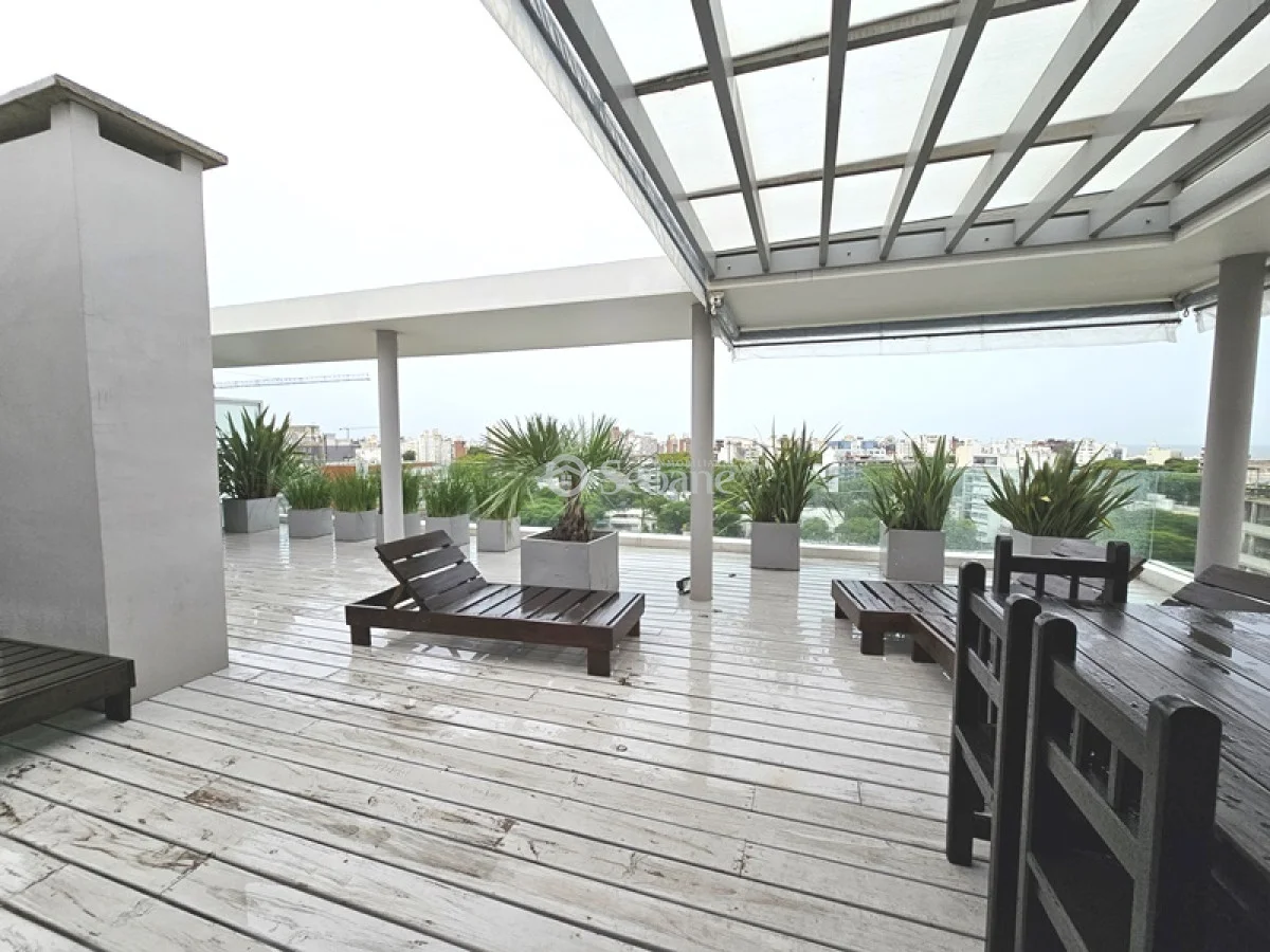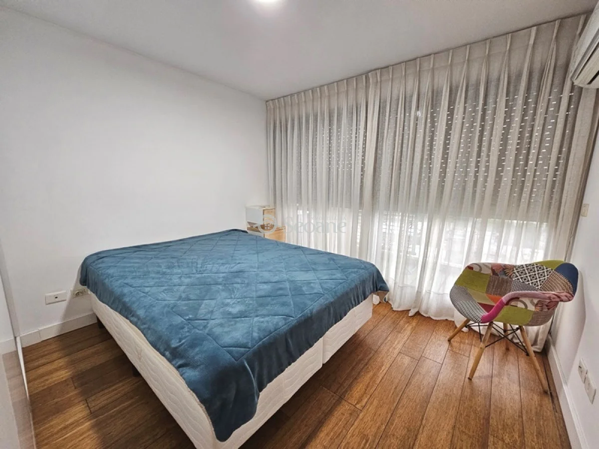 Amplia terraza, próximo al golf y con mobiliario moderno. Living comedor amplio con sillón chaise long, amplio aparador, cocina semi integrada totalmente equipada, amplio baño con mampara y placar, dormitorio al frente con placar. Desde el living y el dormitorio salida a amplia terraza. Aire acondicionado. Garaje compartido (el auto que le corresponde a este apartamento delante y el del otro apartamento detrás).