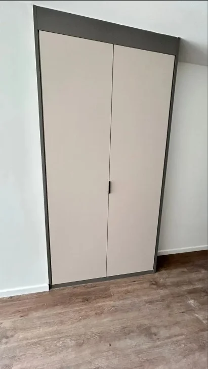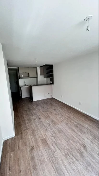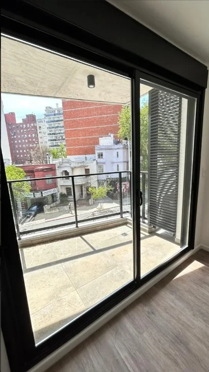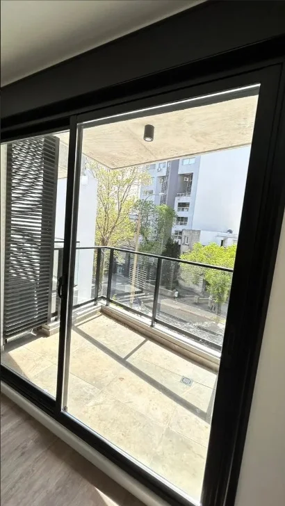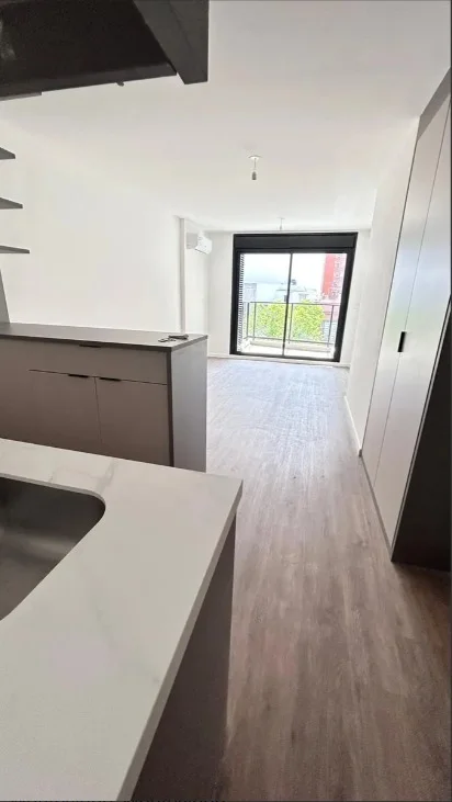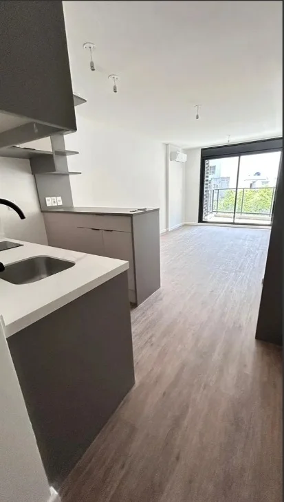 Amplio ambiente con salida al balcón, cocina integrada con muebles aéreos y bajo mesada, horno empotrado, anafe y extractor.