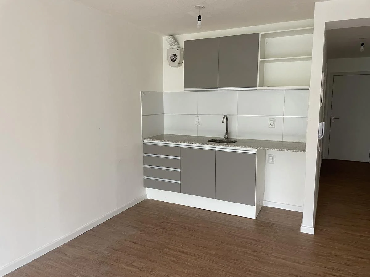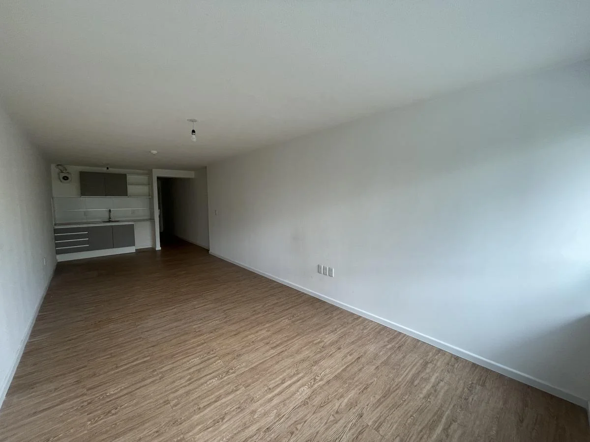 Amplio ambiente con pisos simil madera. Cocina integrada con placares bajo y sobre mesada.
