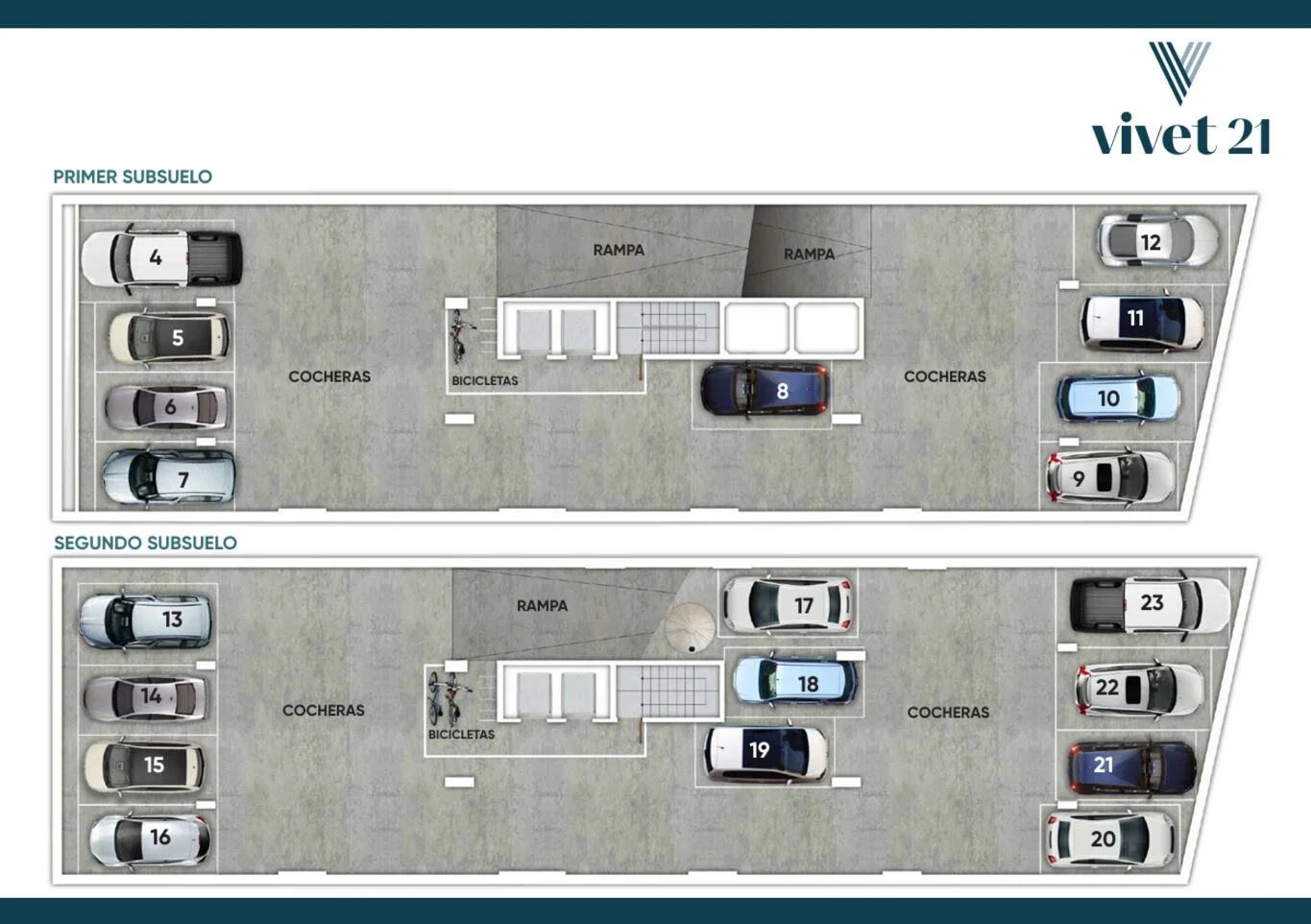 2 subsuelos y 23 cocheras con previsión para carga eléctrica individual