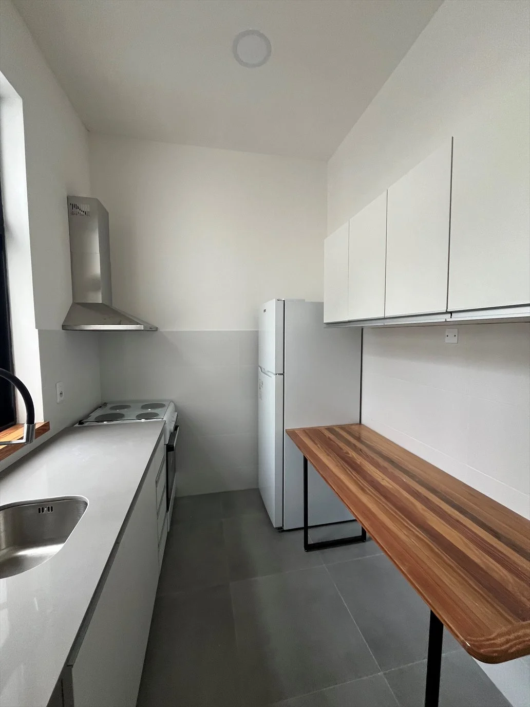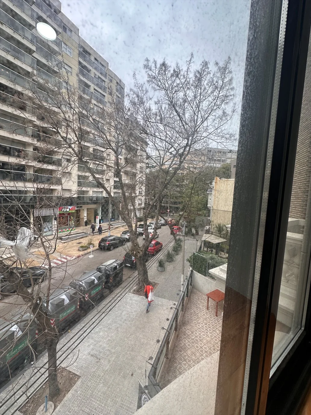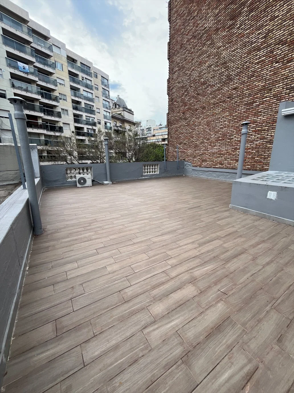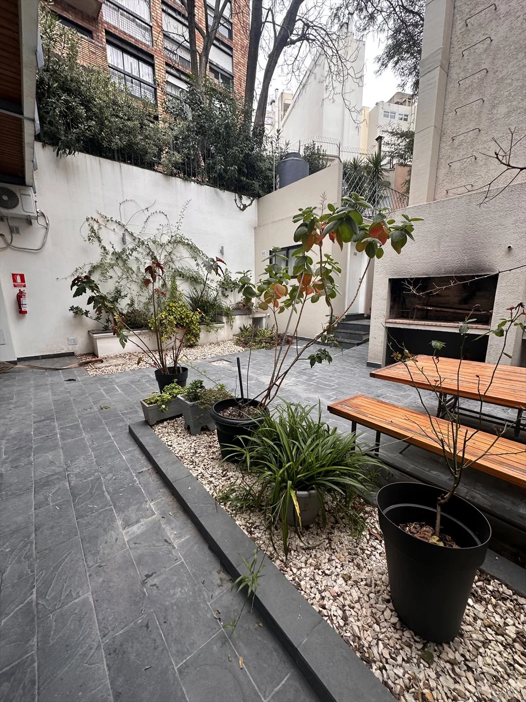 LUMINOSO monoambiente, con cocina definida, primer piso por escalera en edificio de 2 pisos.. Apto para vivienda o consultorio, Doble ventilación. Piso de porcelanato. Portero con visor. Se entrega con placard, cortinas rollers, aire acondicionado, calefón, cocina, heladera, campana, mesa, y banquetas. Edificio con patio y parrillero de uso común, lavadero, lugar para tender ropa y solarium.