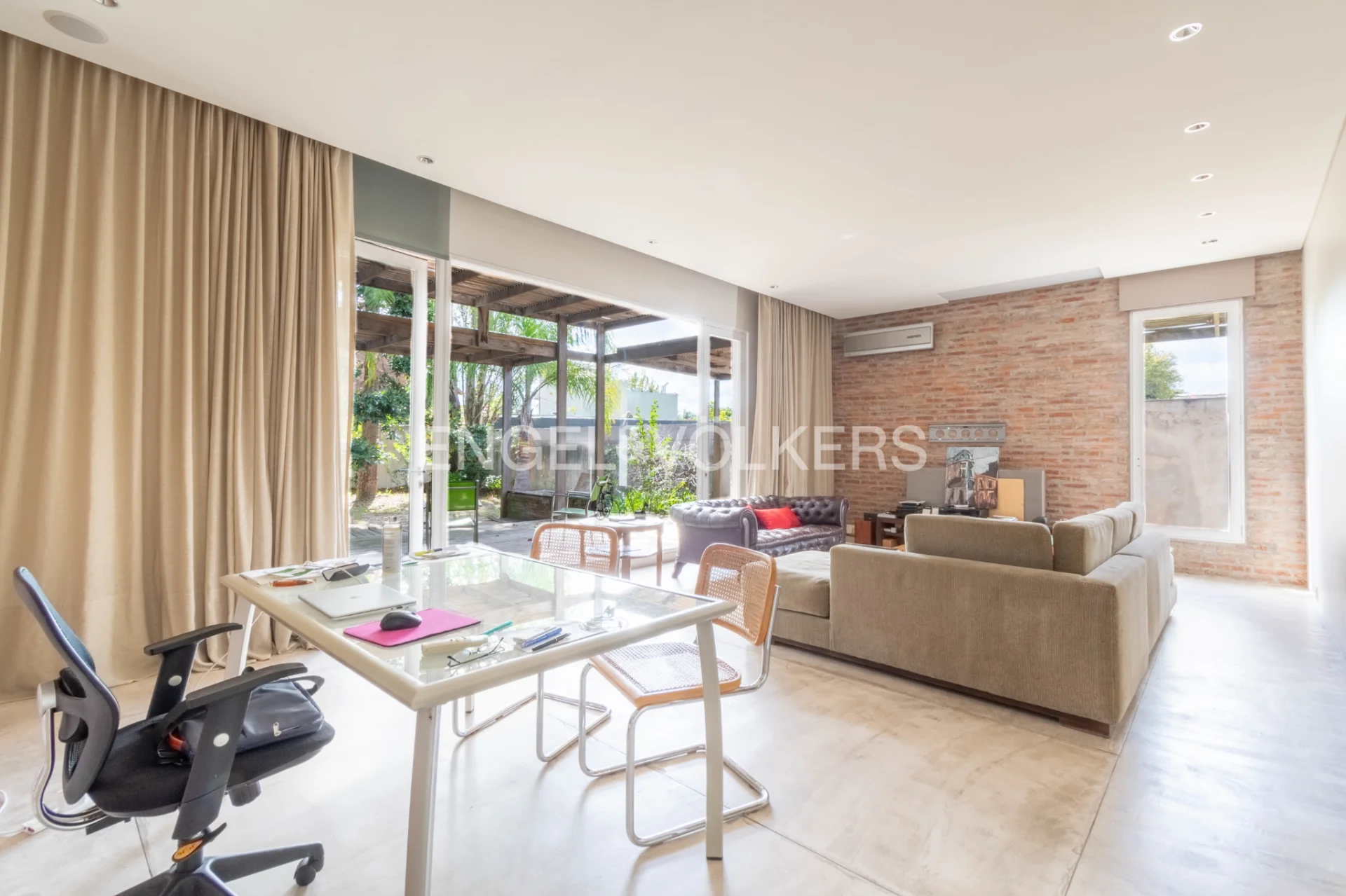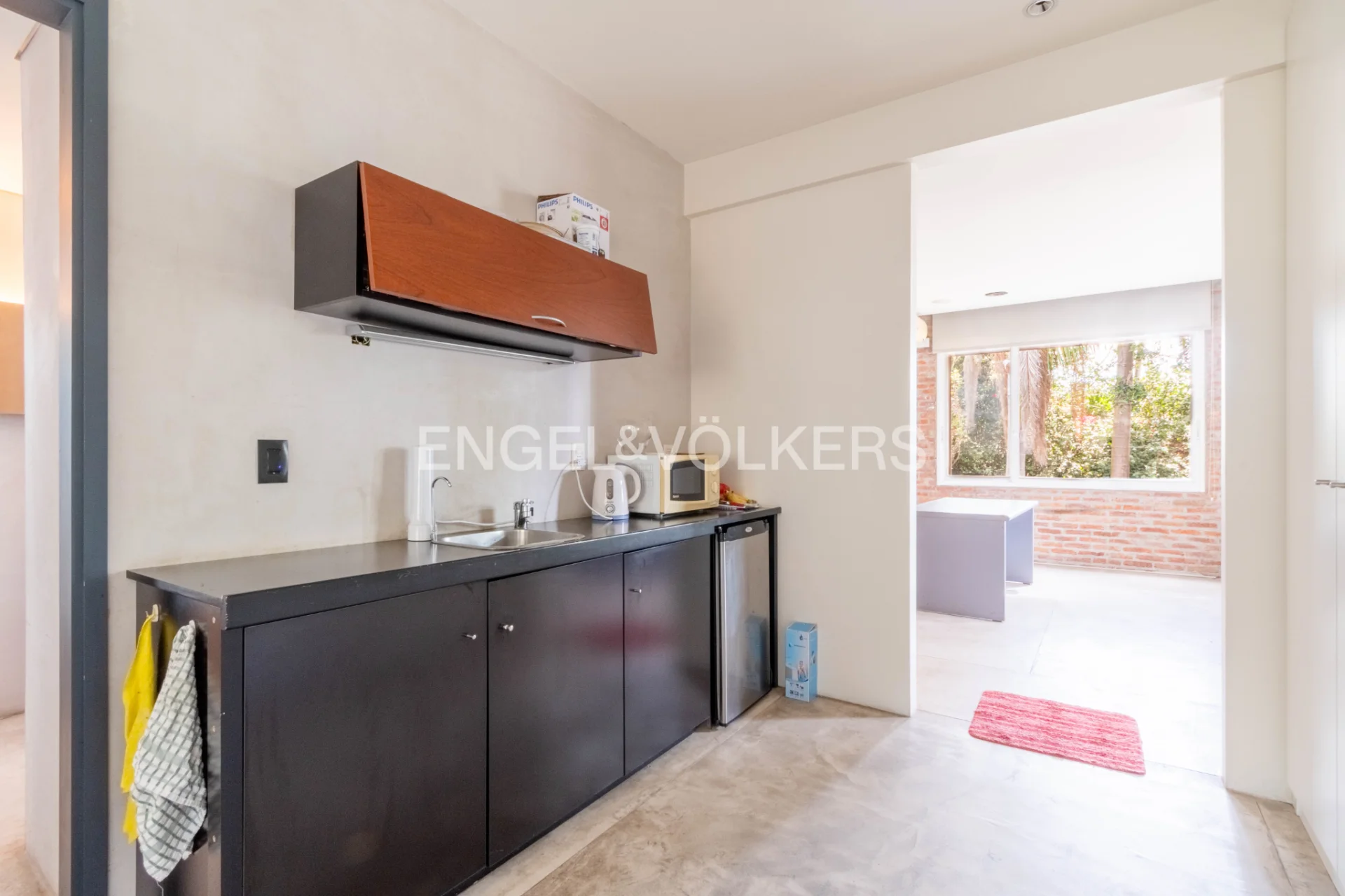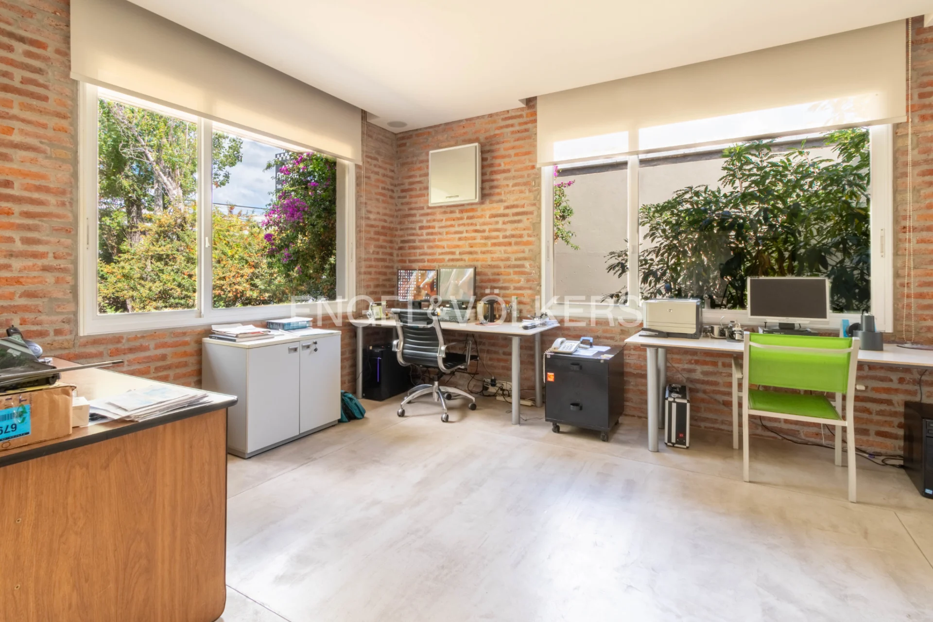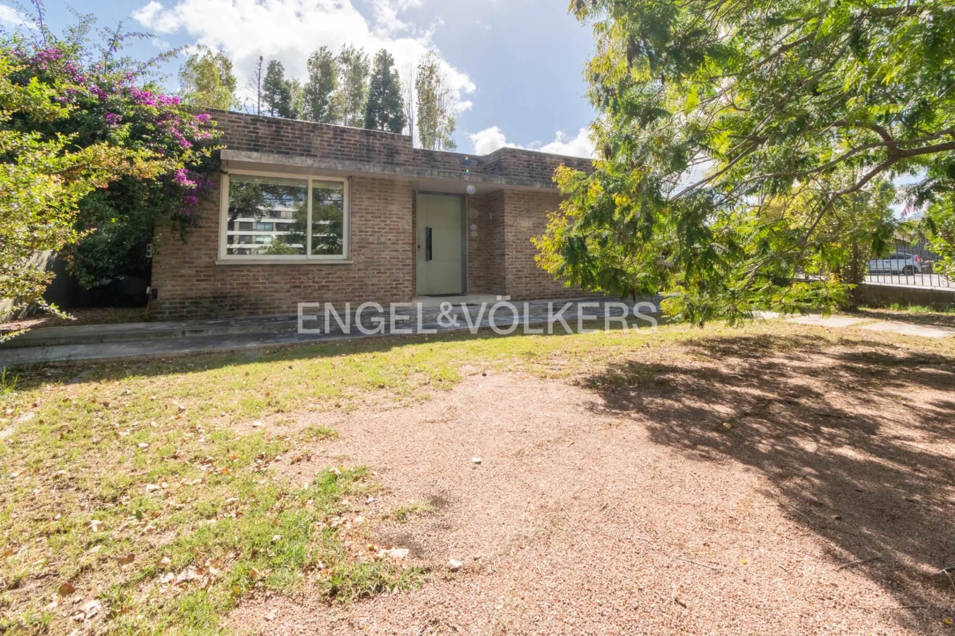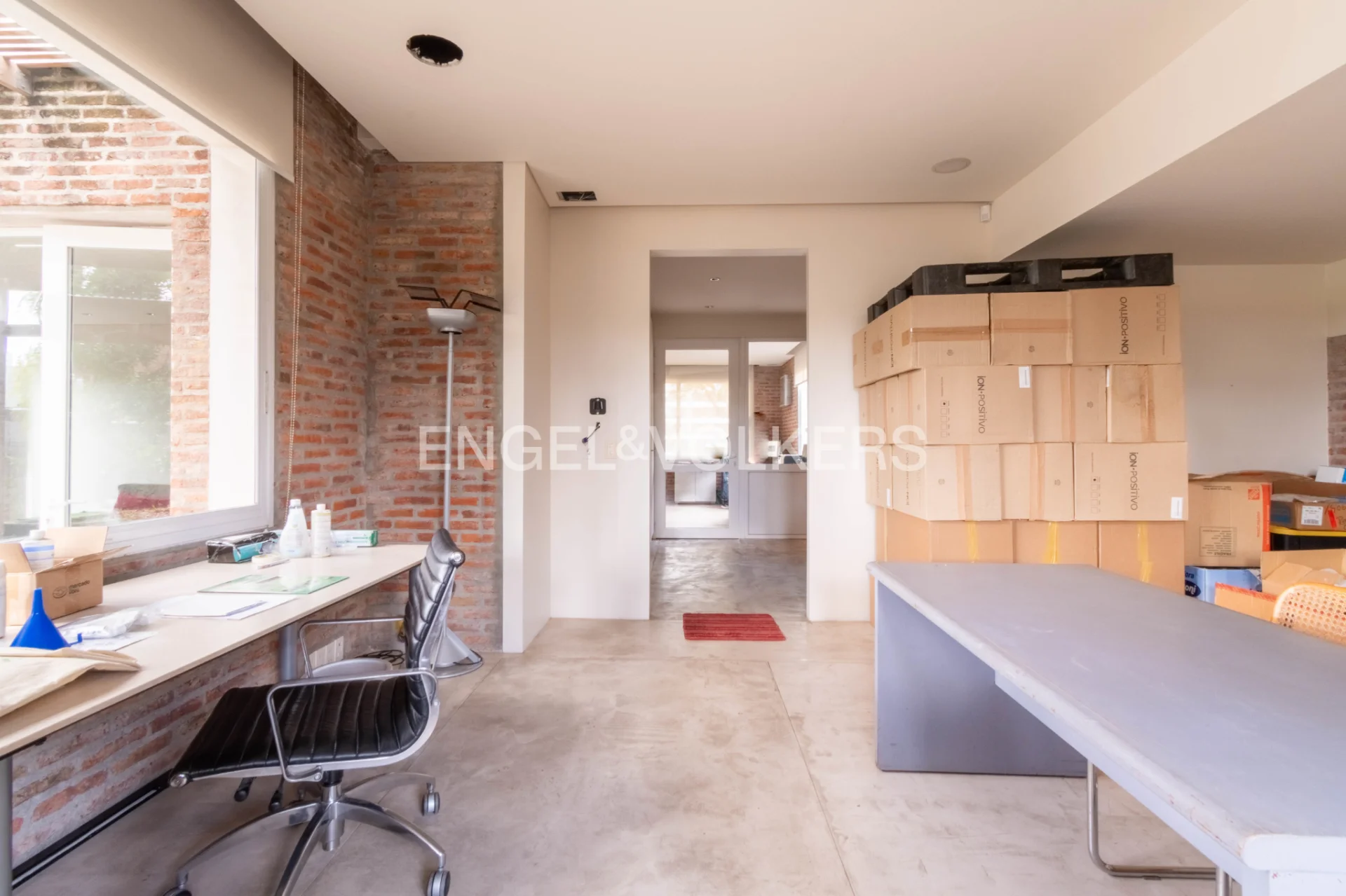 Se accede centralmente mediante hall de distribución con puerta de seguridad accediendo desde el Este. El hall conecta a 3 locales. Un privado de oficina al Norte, una oficina colectiva, sector de exhibición al Oeste (u oficina colectiva o living) en un amplio salón con profusión de aberturas piso techo y vinculación al jardín circundante. Al Sur hay una oficina colectiva para 2 o 3 personas con ventana a la Avenida, y mediante el paso por un sector servicios que incluiría kitchenette y baño se accede a una oficina posterior con ventanas al jardín como para 4 puestos de trabajo mínimo.