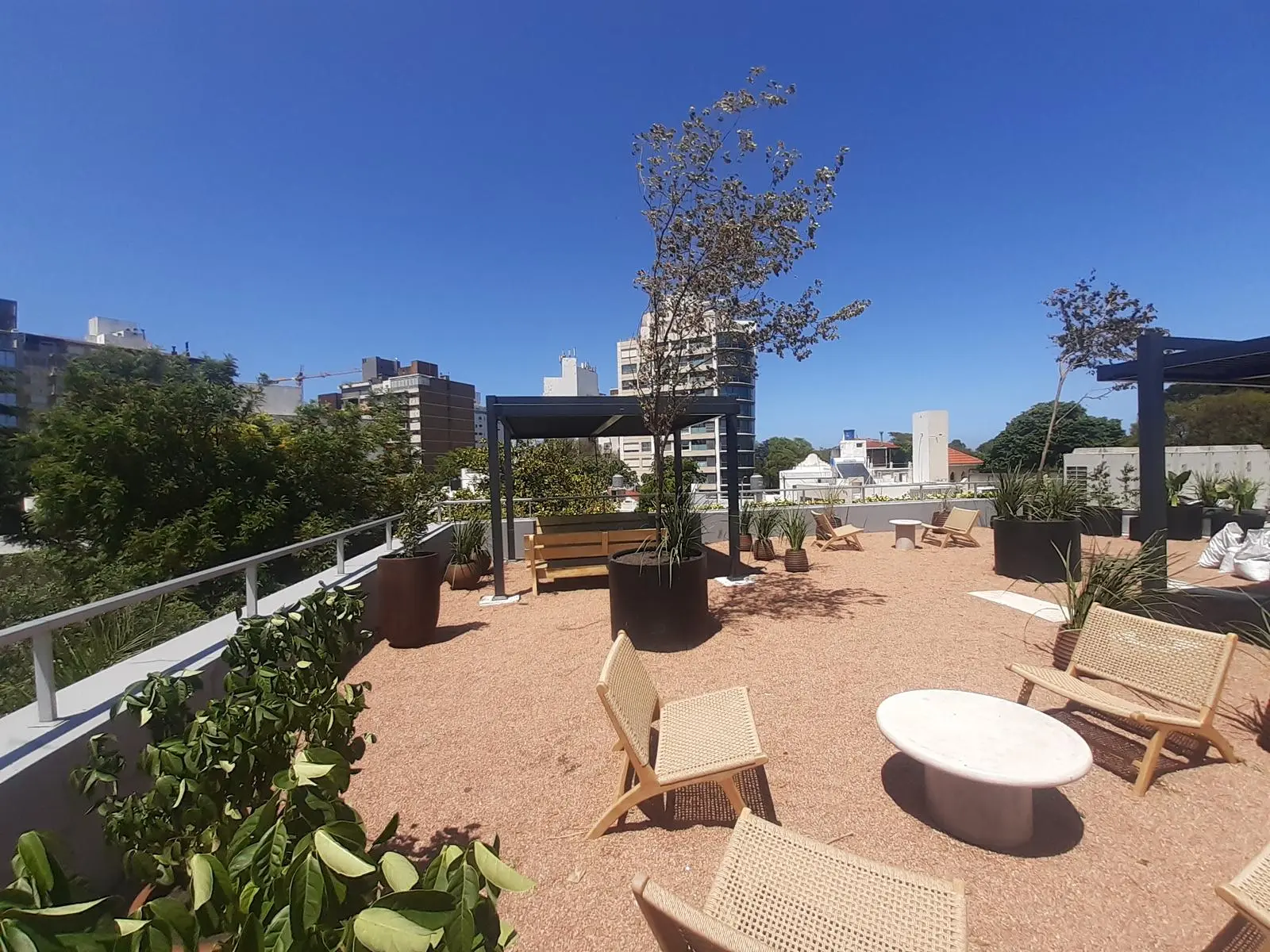 Jardín interior y espacio al aire libre con parrillero en la terraza.