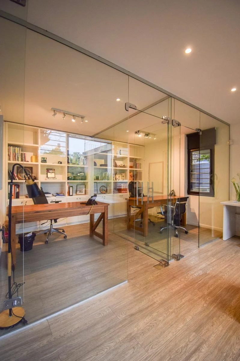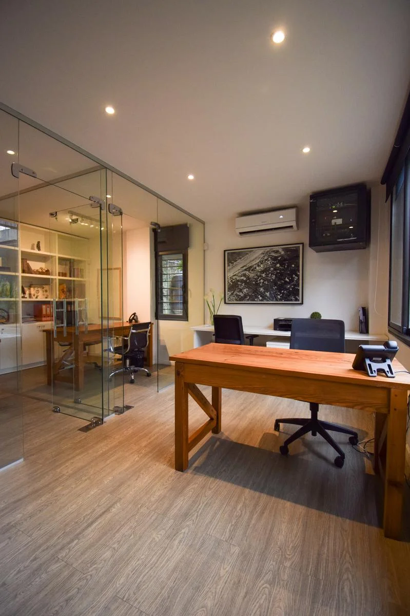 Oficina A cuenta con espacio común y 2 privados vidriados con biblioteca empotrada y muebles (3 mesas de madera y sillas)