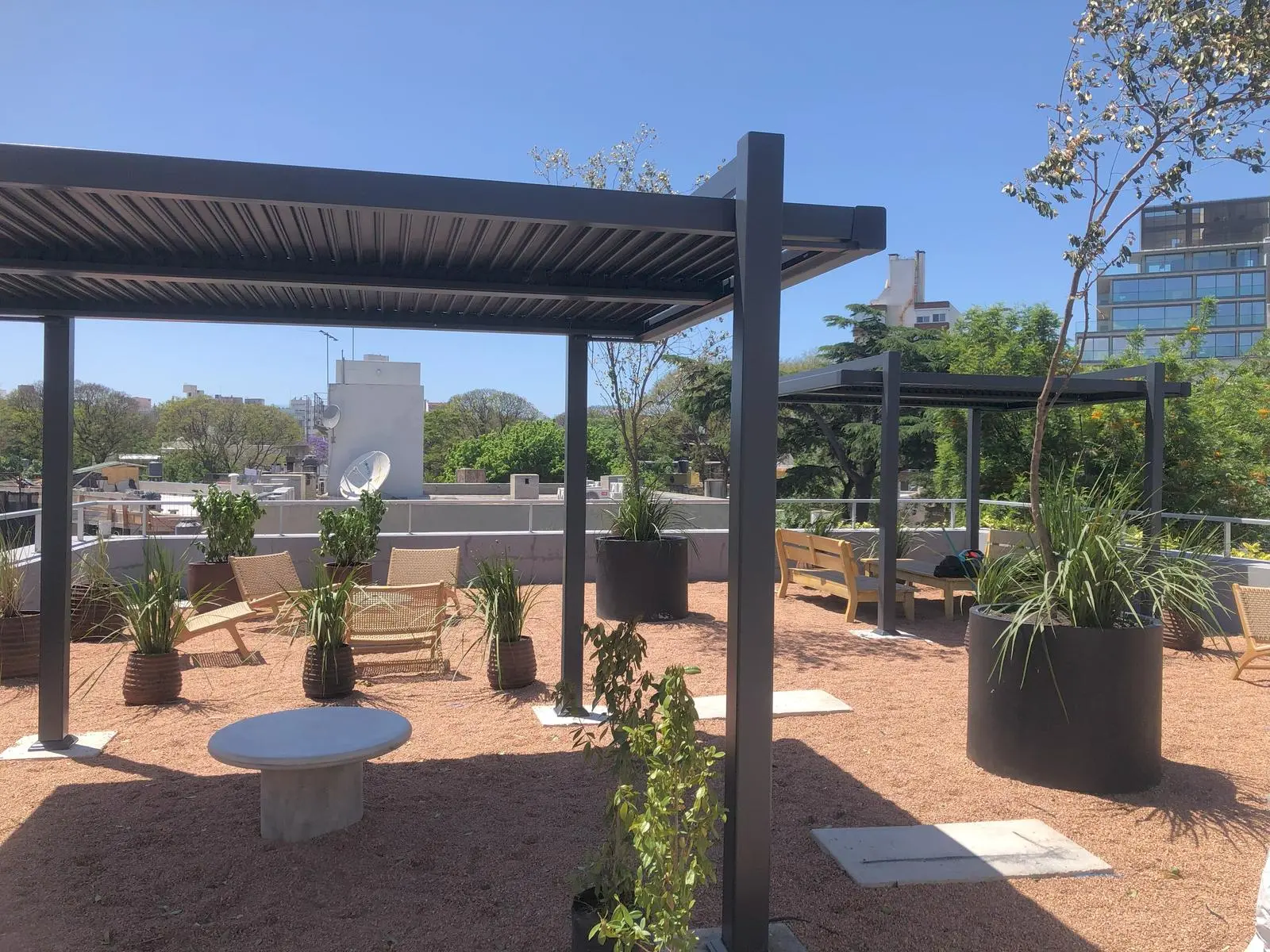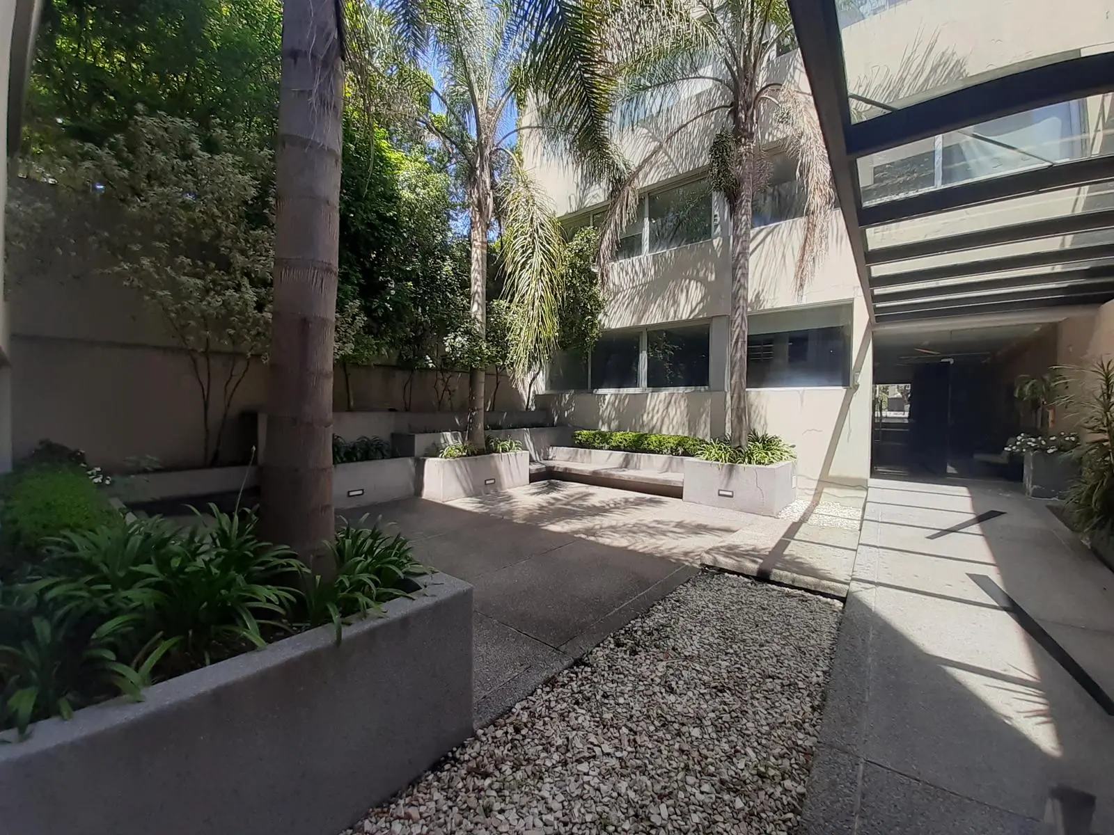Jardín interior y espacio al aire libre con parrillero en la terraza.