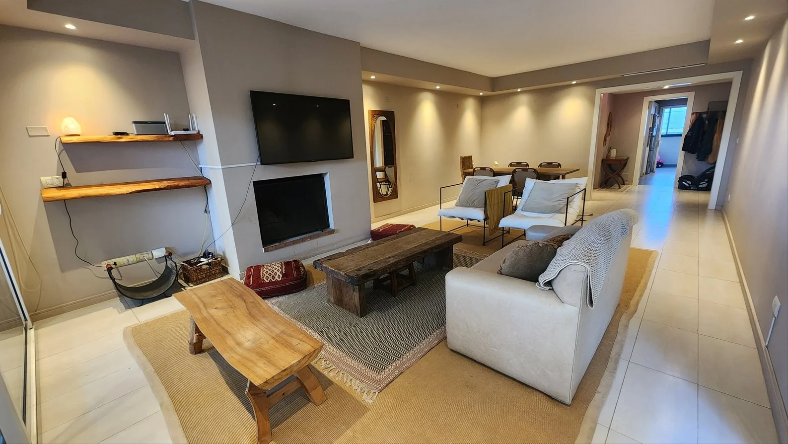 Living comedor con estufa a leña y salida al jardín.