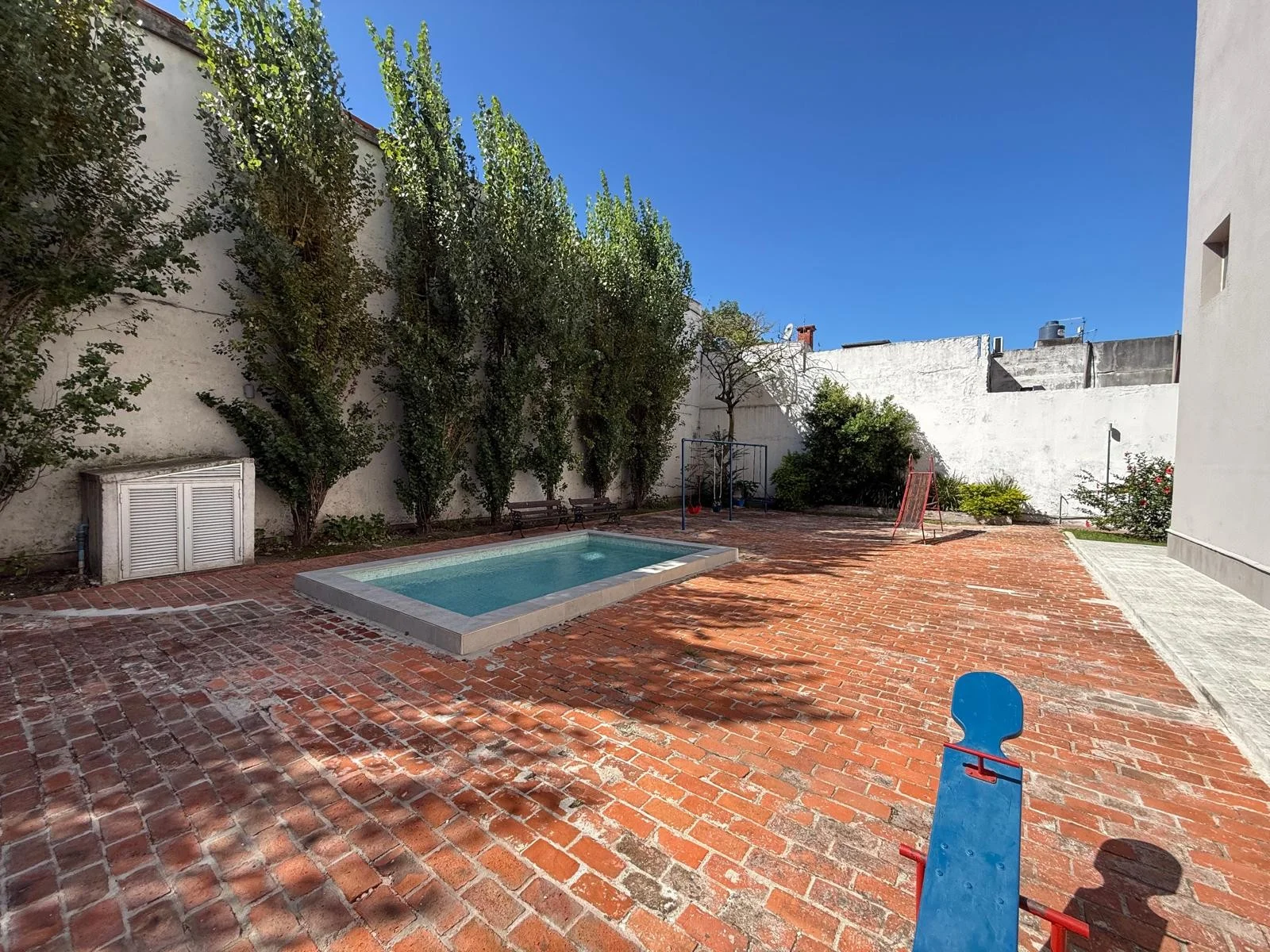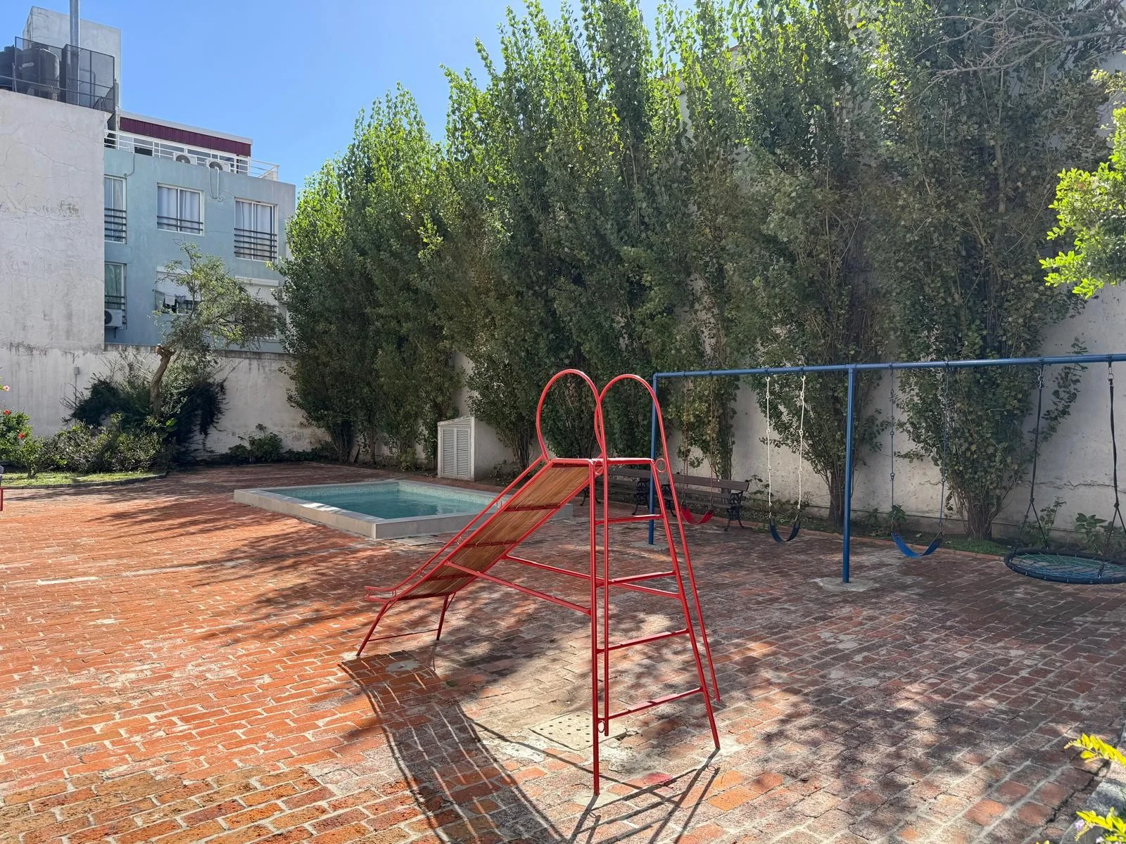 El edificio cuenta con fondo comun con juegos y pisina para niños.