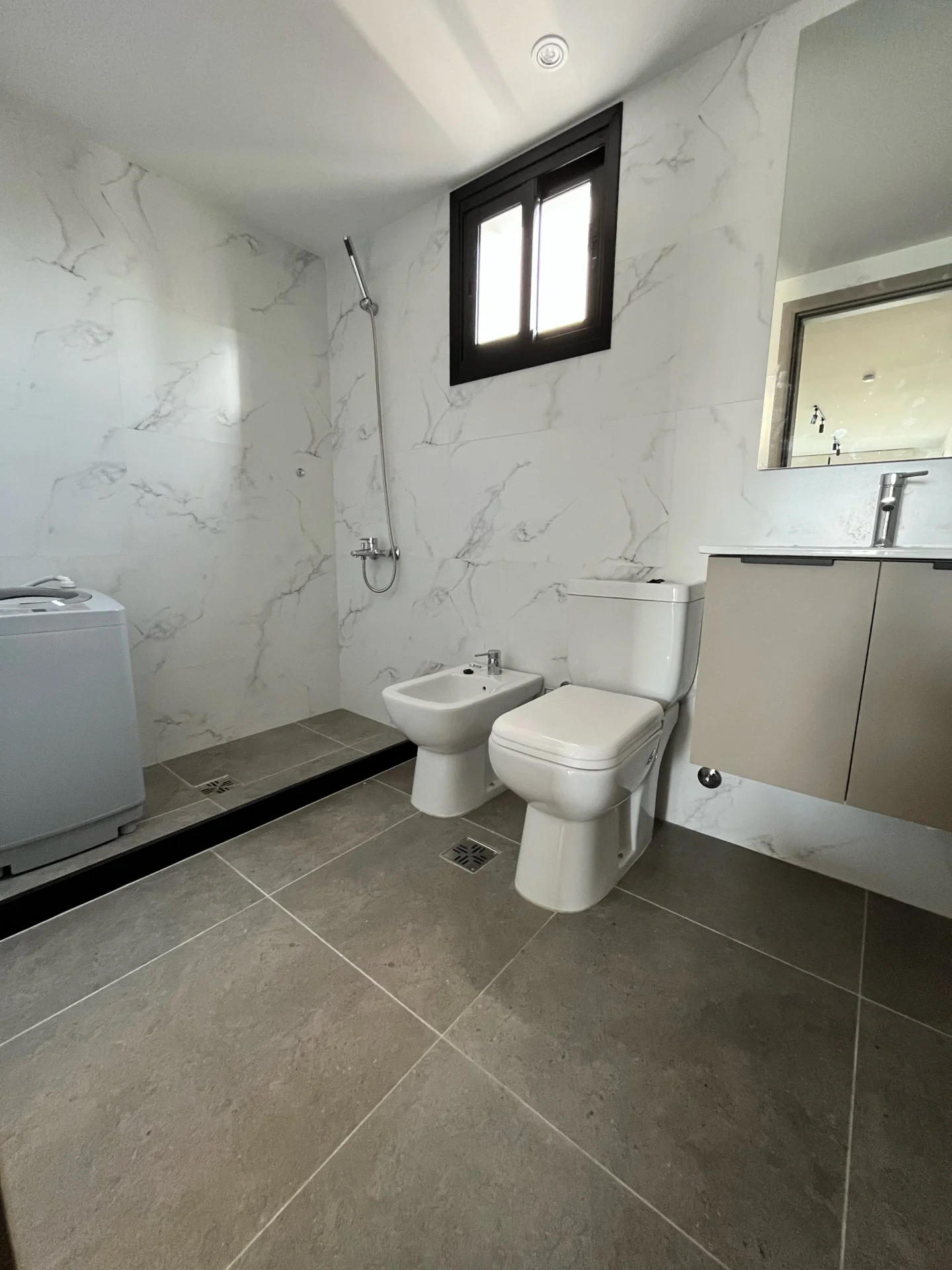 Se entrega con mampara y espejo en el bano, anafe, horno, campana, calefon y lavadora en la cocina.