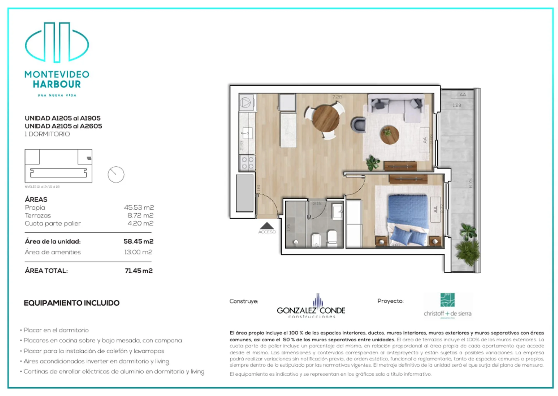 Ingresamos al living comedor con ambientes amplios y luminosos, la cocina esta integrada y vienen con bajo mesada y aéreo con campana de extracción. Tiene previsto la previsión para el calefón y lavarropas, quedando ocultos e integrados al mobiliario. El dormitorio es muy cómodo y luminoso , incluye placar y tiene una vista despegada hacia la Bahia de Montevideo. Incluye amplio placar con todas las comodidades.